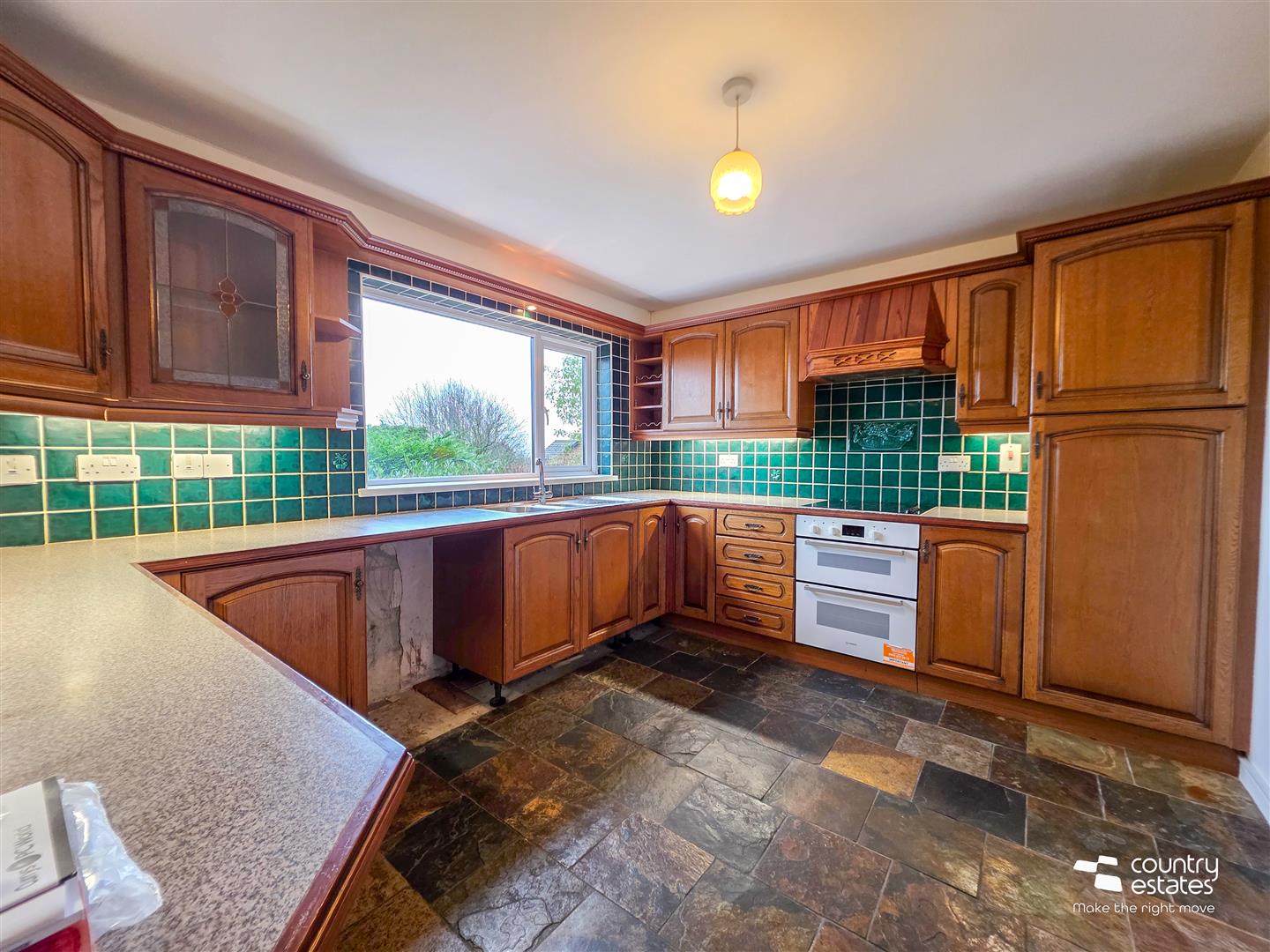 Equipped with a comprehensive range of high and low level shake style fitted units with contrasting work surfaces. One and a half bowl single drainer stainless steel sink unit with mixer tap. Integrated double oven, separate four ring electric hob with overhead extractor fan. Under counter fridge and freezer. Part tiled walls. Leaded glass display cabinet. Tiled floor.