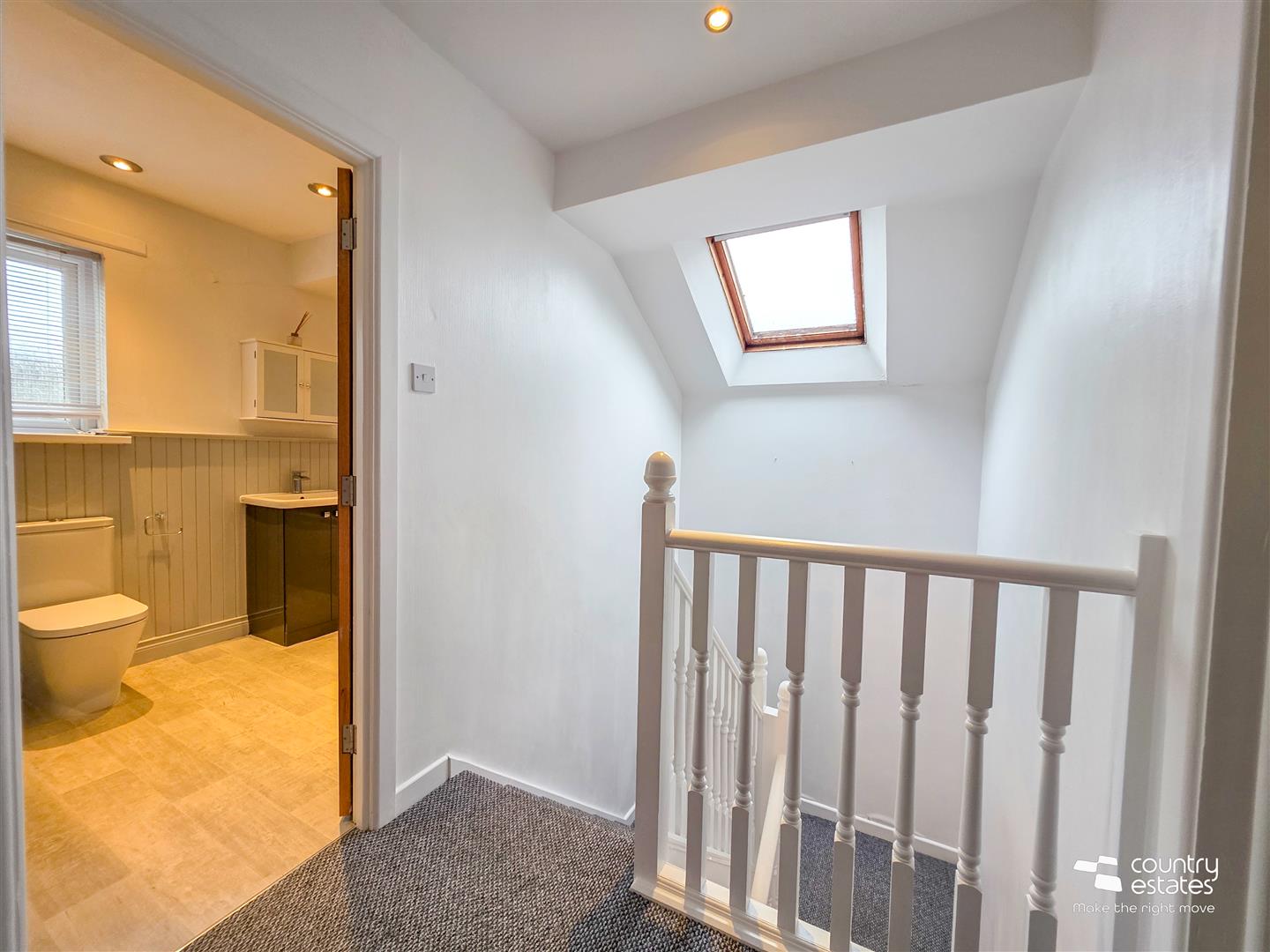 Half landing with velux window. Access to roof space. Shelved storage cupboard.