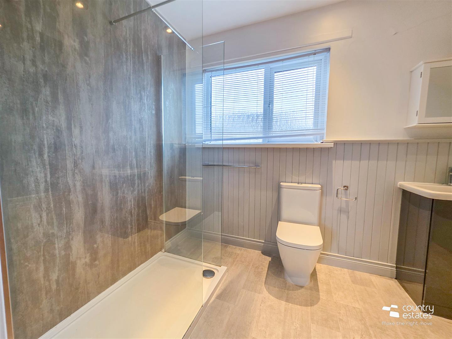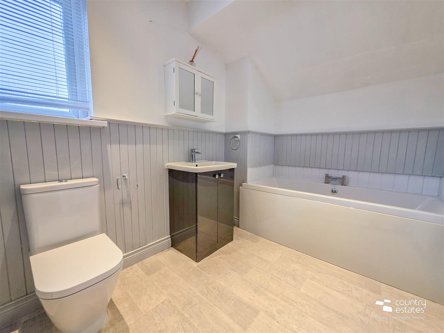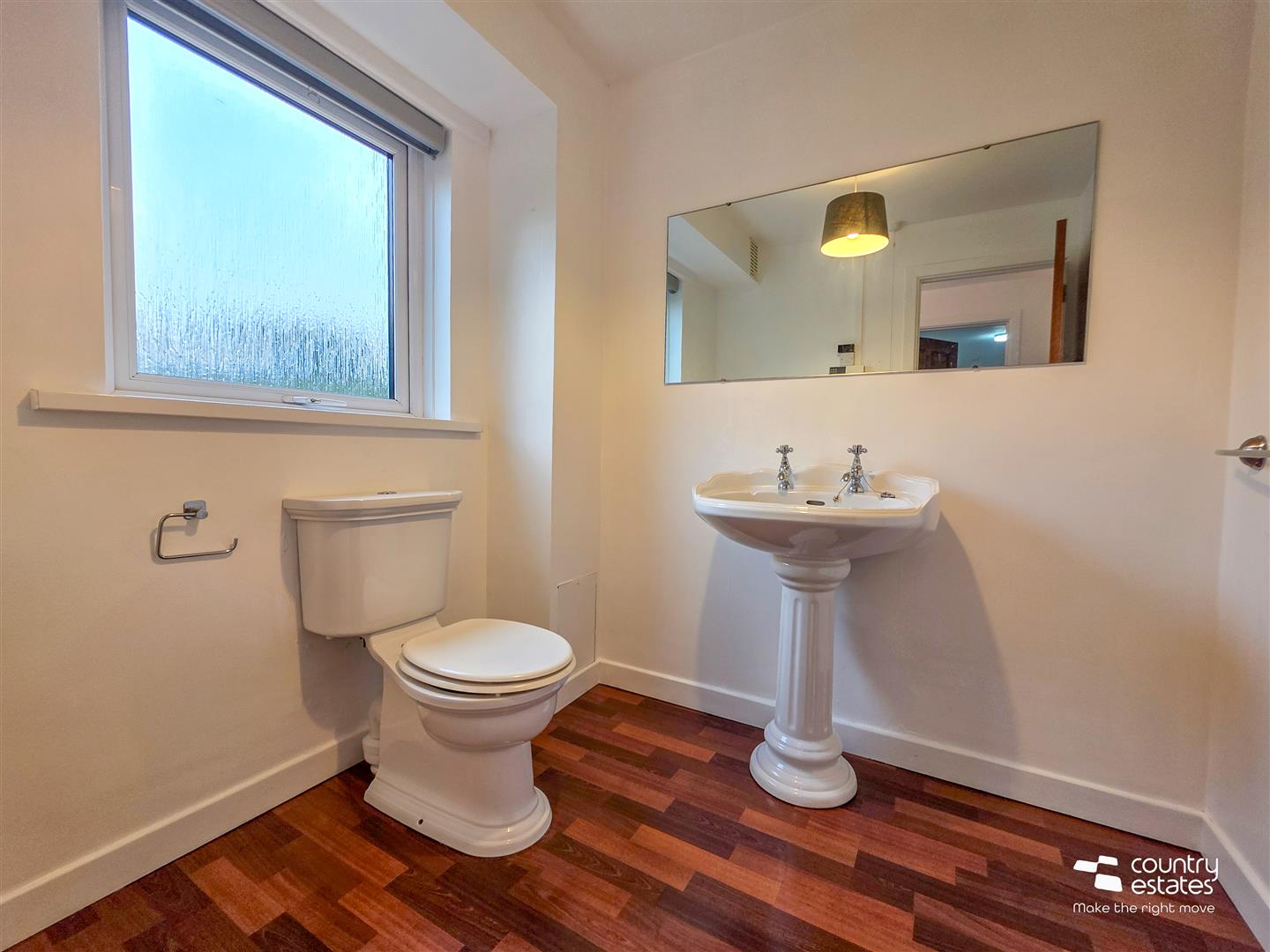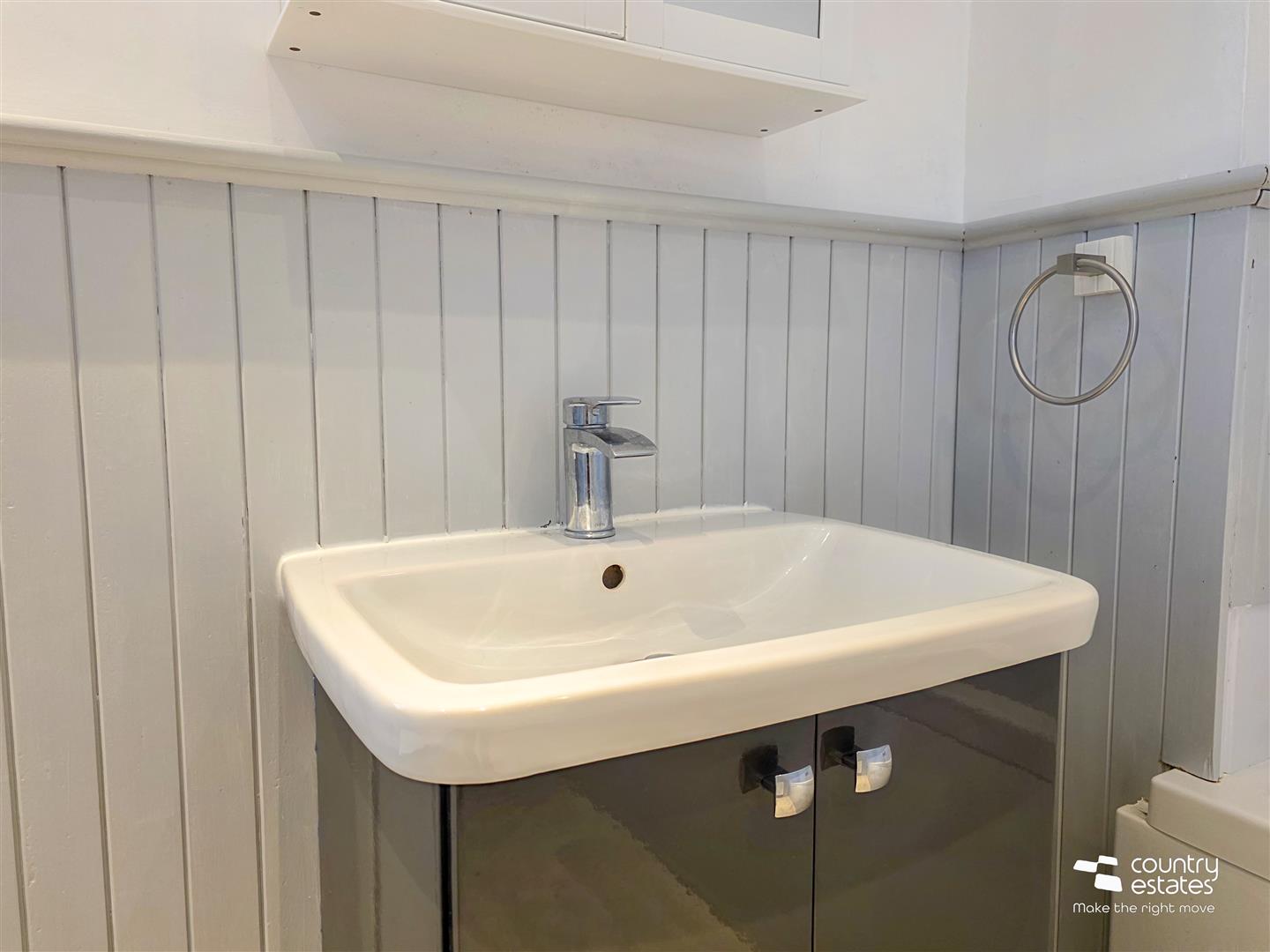 Comprising pedestal wash hand basin and a button flush WC. Laminate flooring.