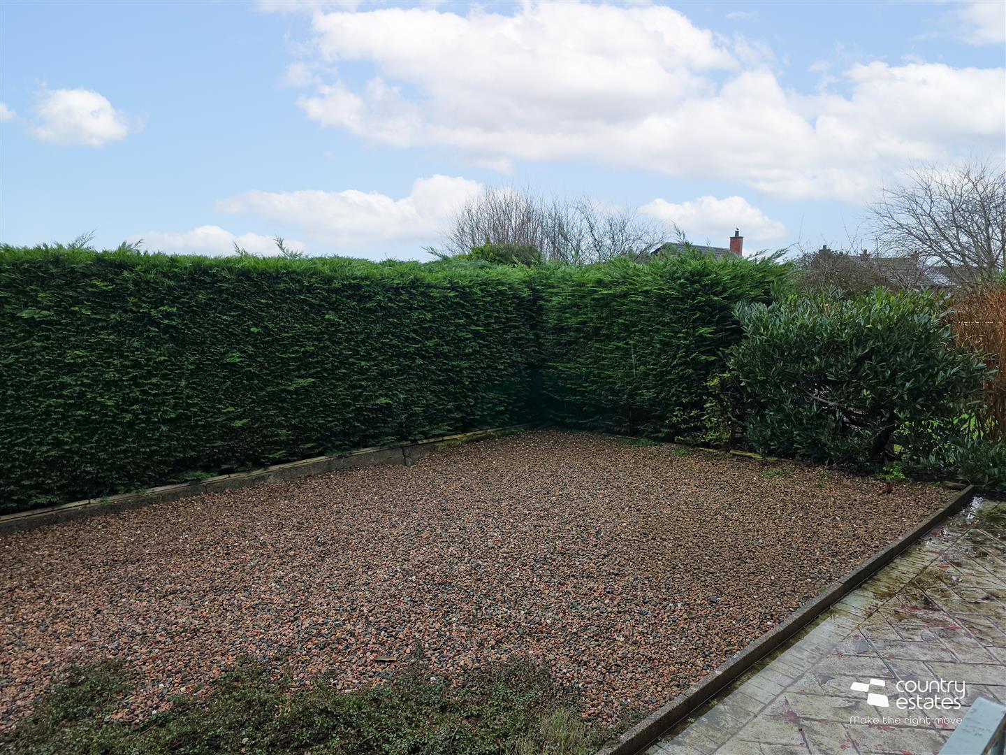 Private pebbled garden to rear with paved walkways. Screened by hedgerow.