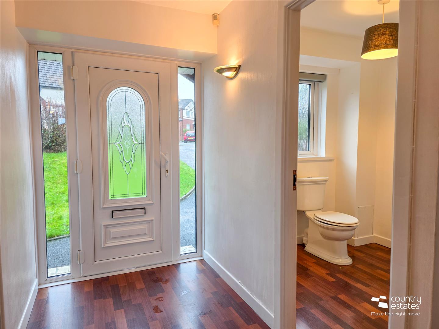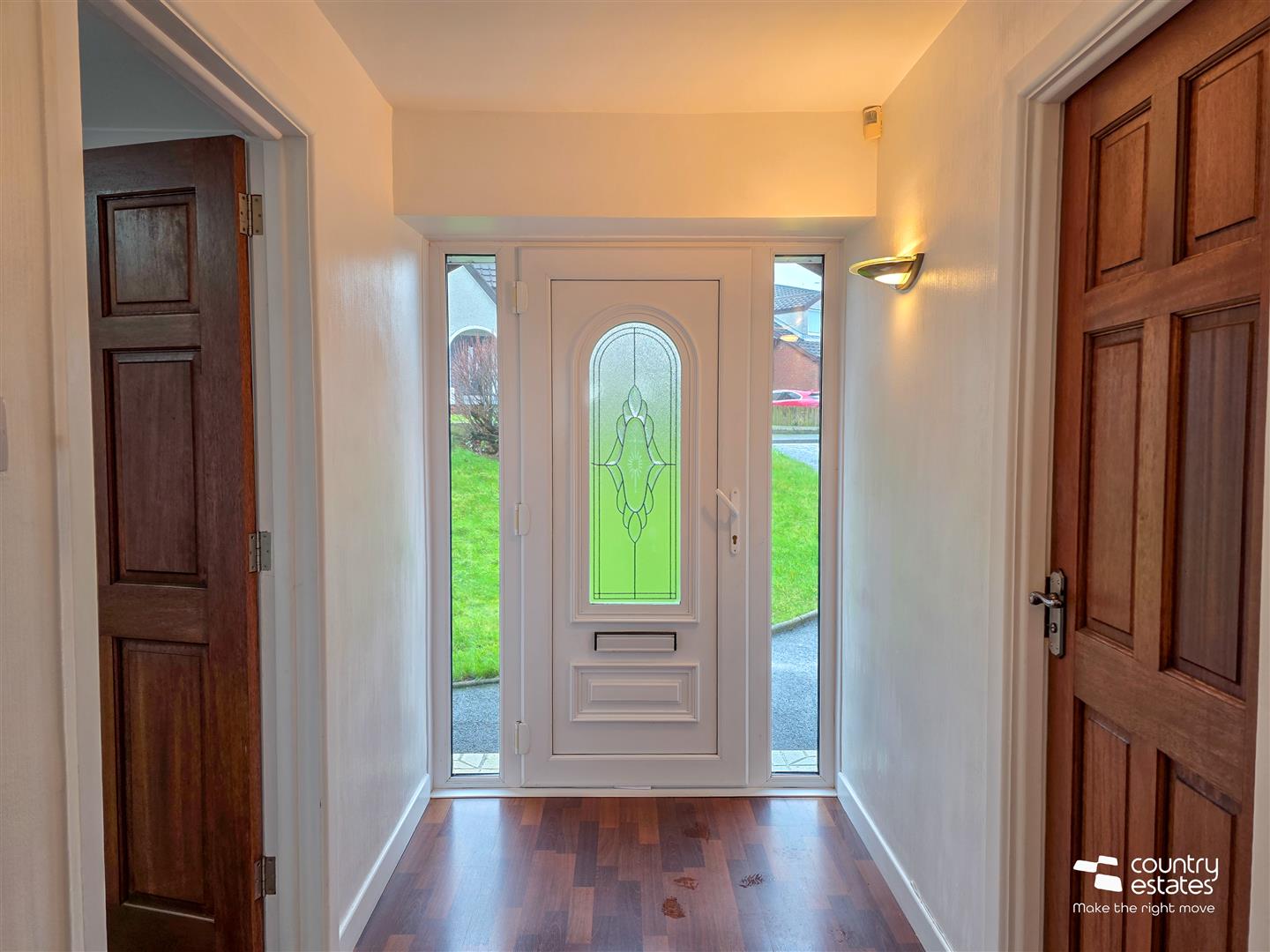 PVC double glazed front door with matching side screens into spacious, well presented entrance hall. Quality laminate flooring. Under stairs storage cupboard.
