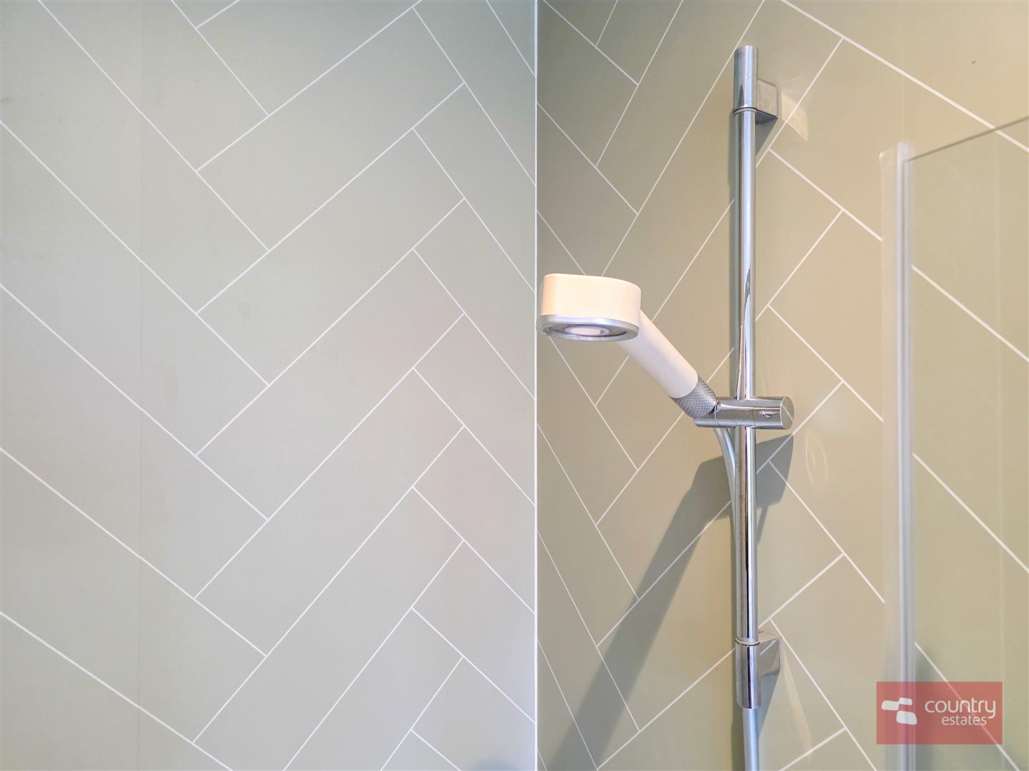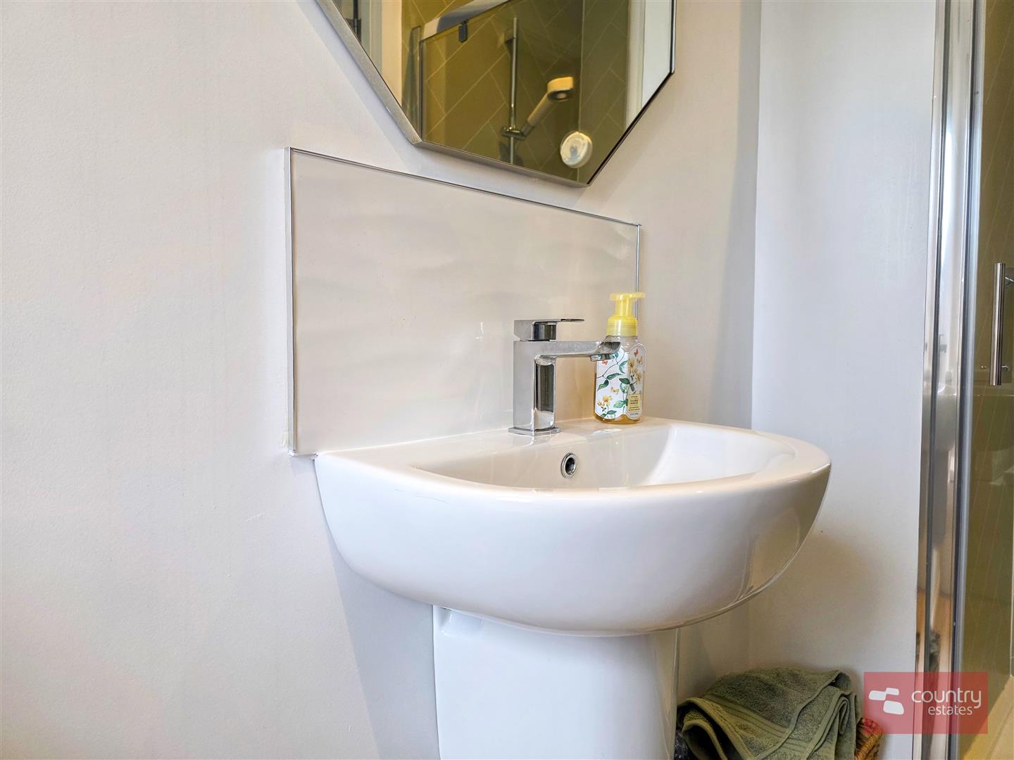 Comprising PVC panelled shower cubicle with thermostatically controlled shower, Semi-pedestal wash hand basin with monobloc tap and tiled splash back and a button flush WC. Chrome towel radiator. Recessed down lighting.
