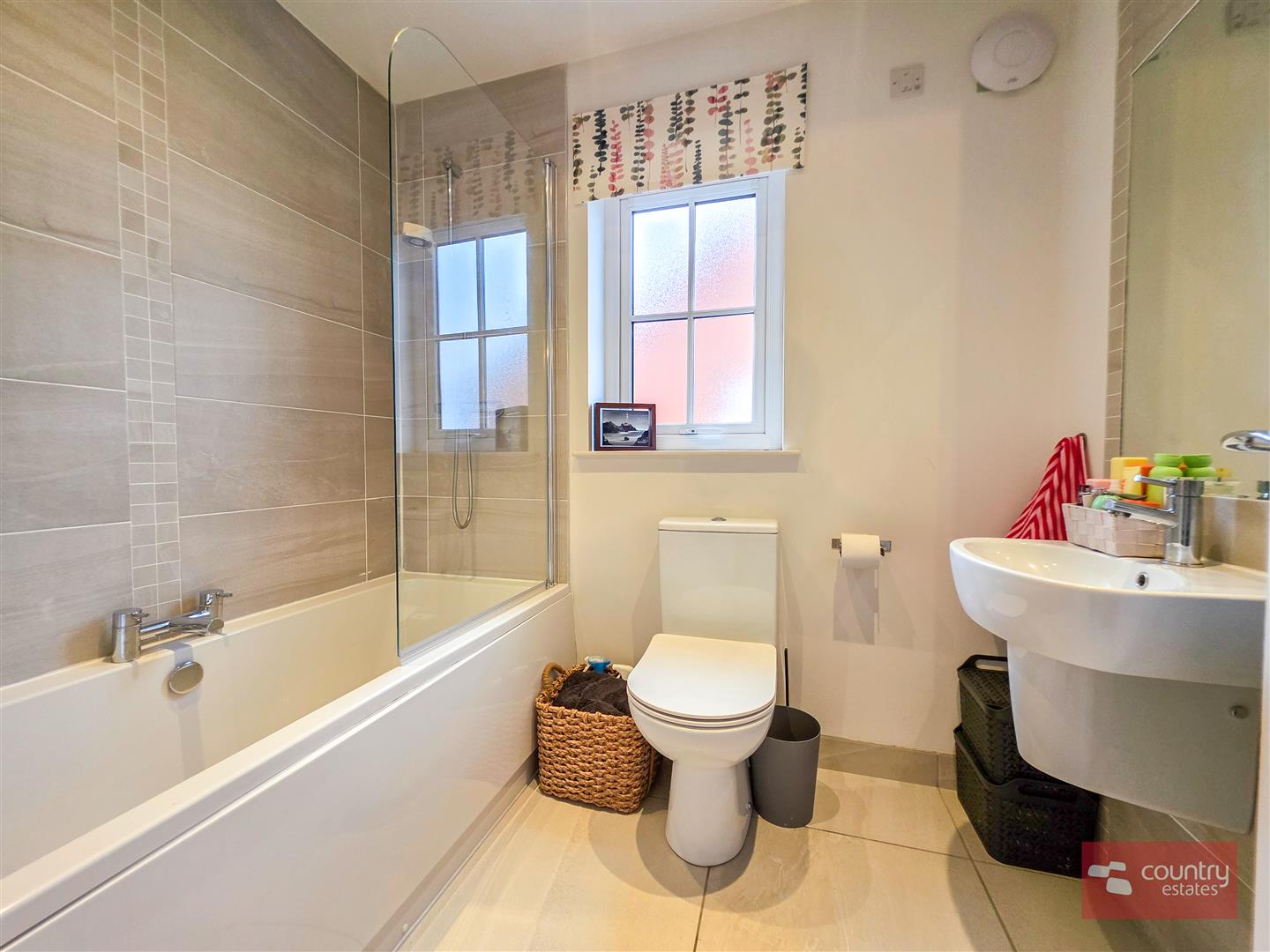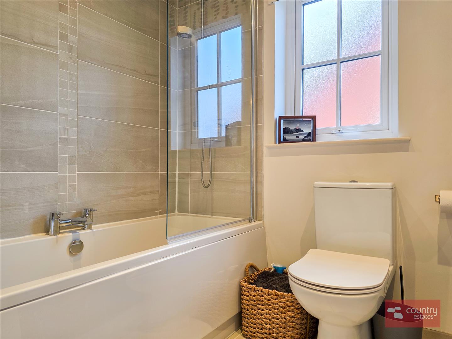Comprising double ended panel bath tub with glazed shower screen and shower over bath, semi-pedestal wash hand basin and a button flush WC. Part tiled walls. Recessed down lighting.