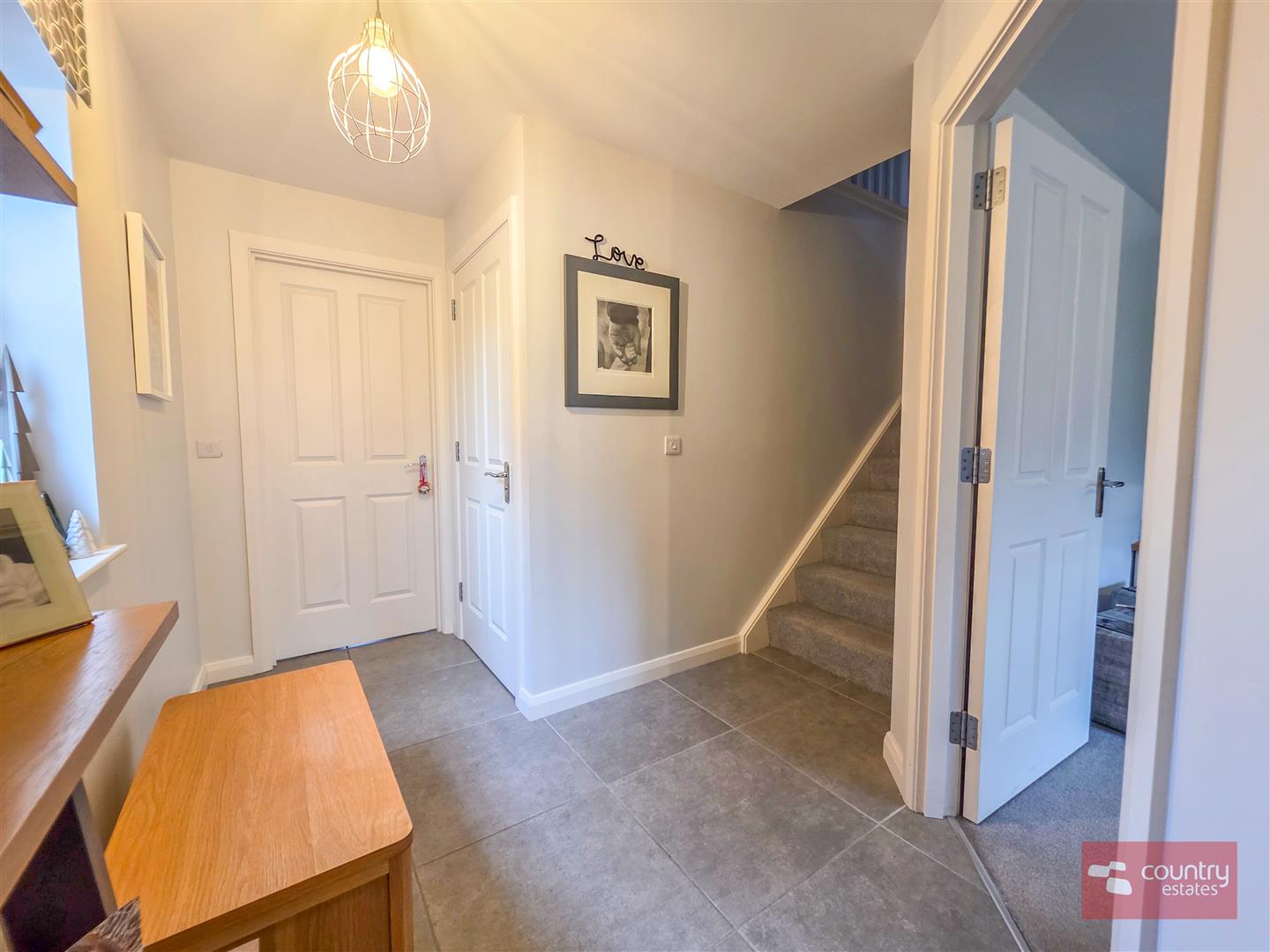 Composite front door with top light into spacious well presented entrance hall with ceramic tiled floor.