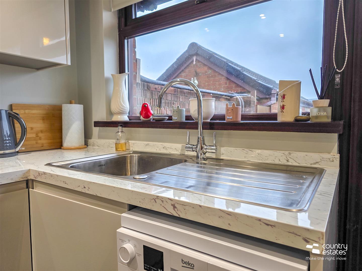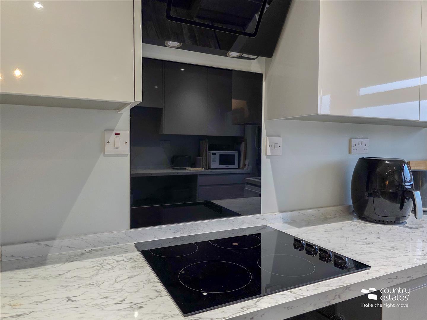 Equipped with a comprehensive range of high and low level gloss fitted kitchen units and contrasting work surfaces and upstands. Single drainer stainless steel sink unit with swan neck mixer tap. Boasting a range of integrated appliances to include oven, separate hob, overhead angled extractor fan and fridge freezer. Fixed breakfast bar. Quality laminate flooring. PVC double glazed door to rear. Recessed downlighting.