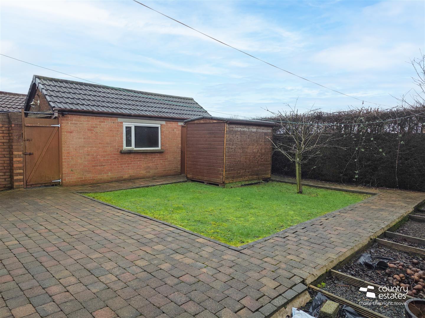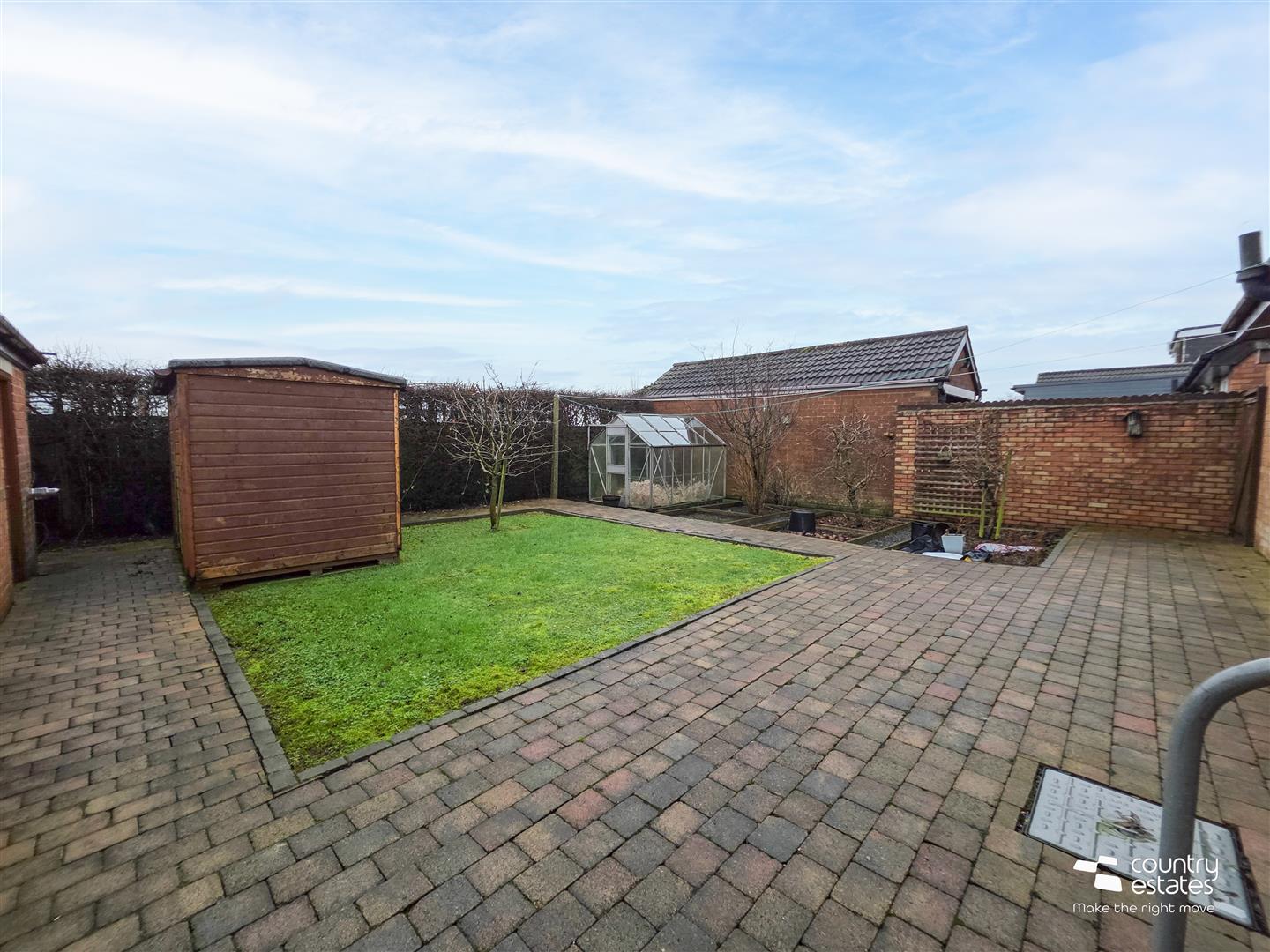 Extensive enclosed garden to rear, screened by perimeter fence. Garden in lawn with block paved walkways. Planted apple and pear trees. Garden shed and greenhouse. Outside tap.
