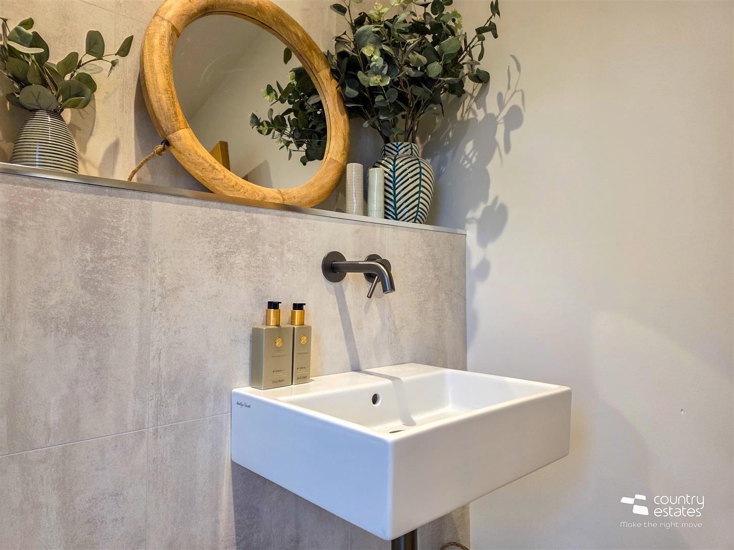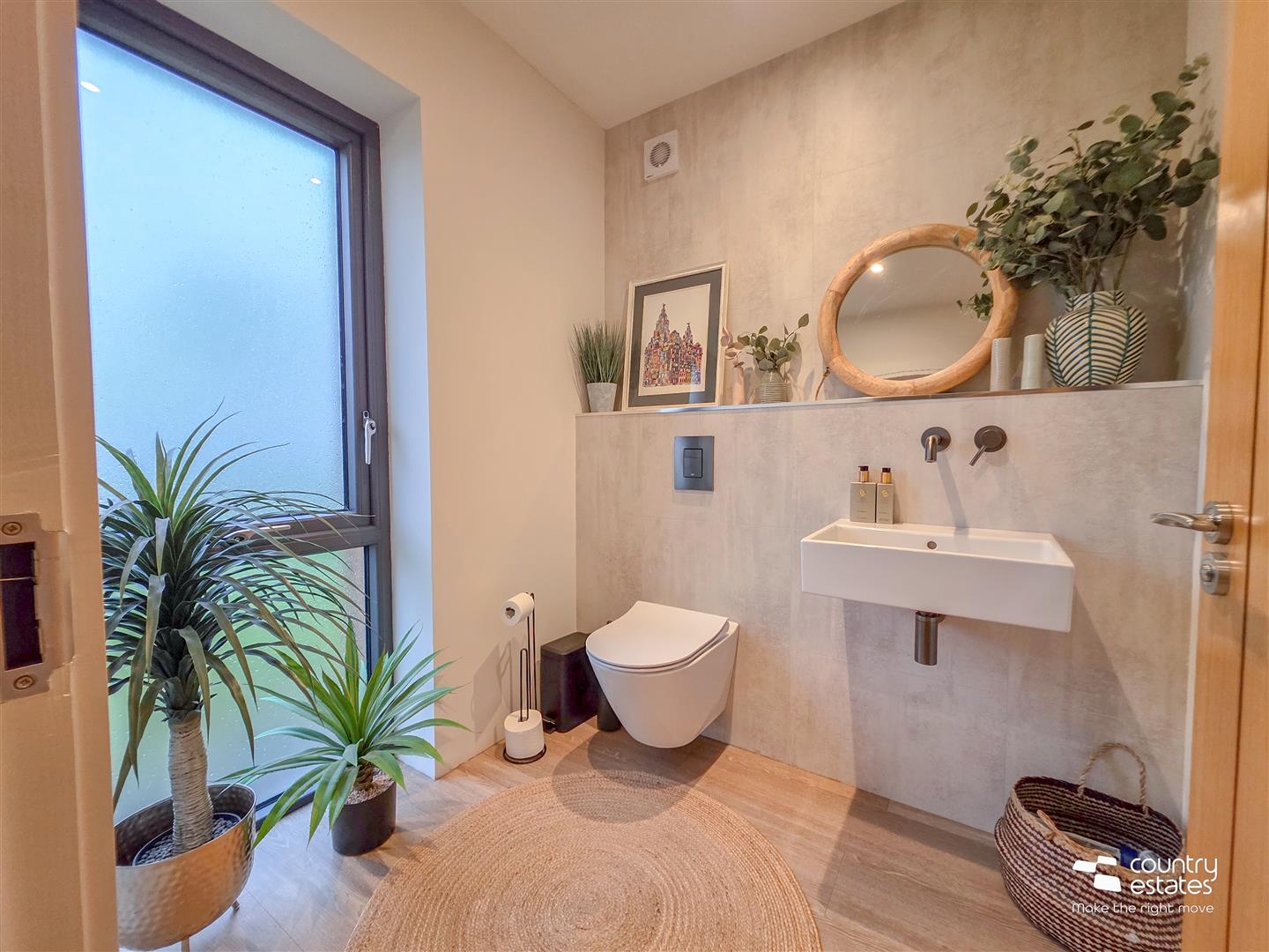 Comprising wall push 'Grohe' w.c. Feature stone effect panelled accent wall with wall hung modern sink with wall mounted lever tap in gunmetal grey. Feature floor to ceiling double glazed frosted window.