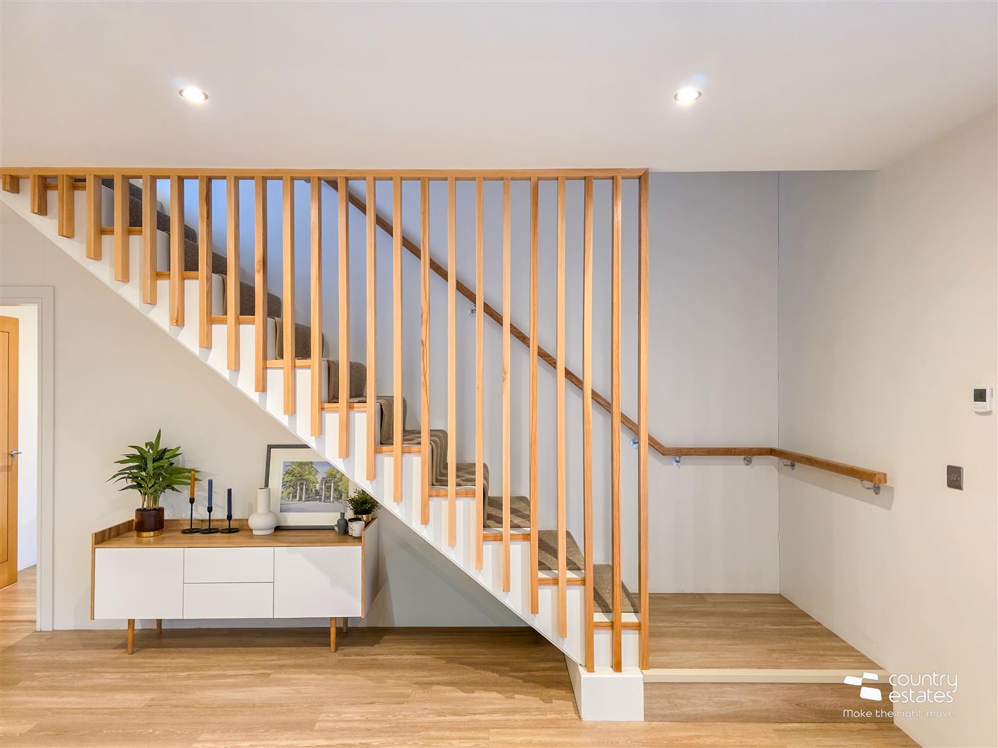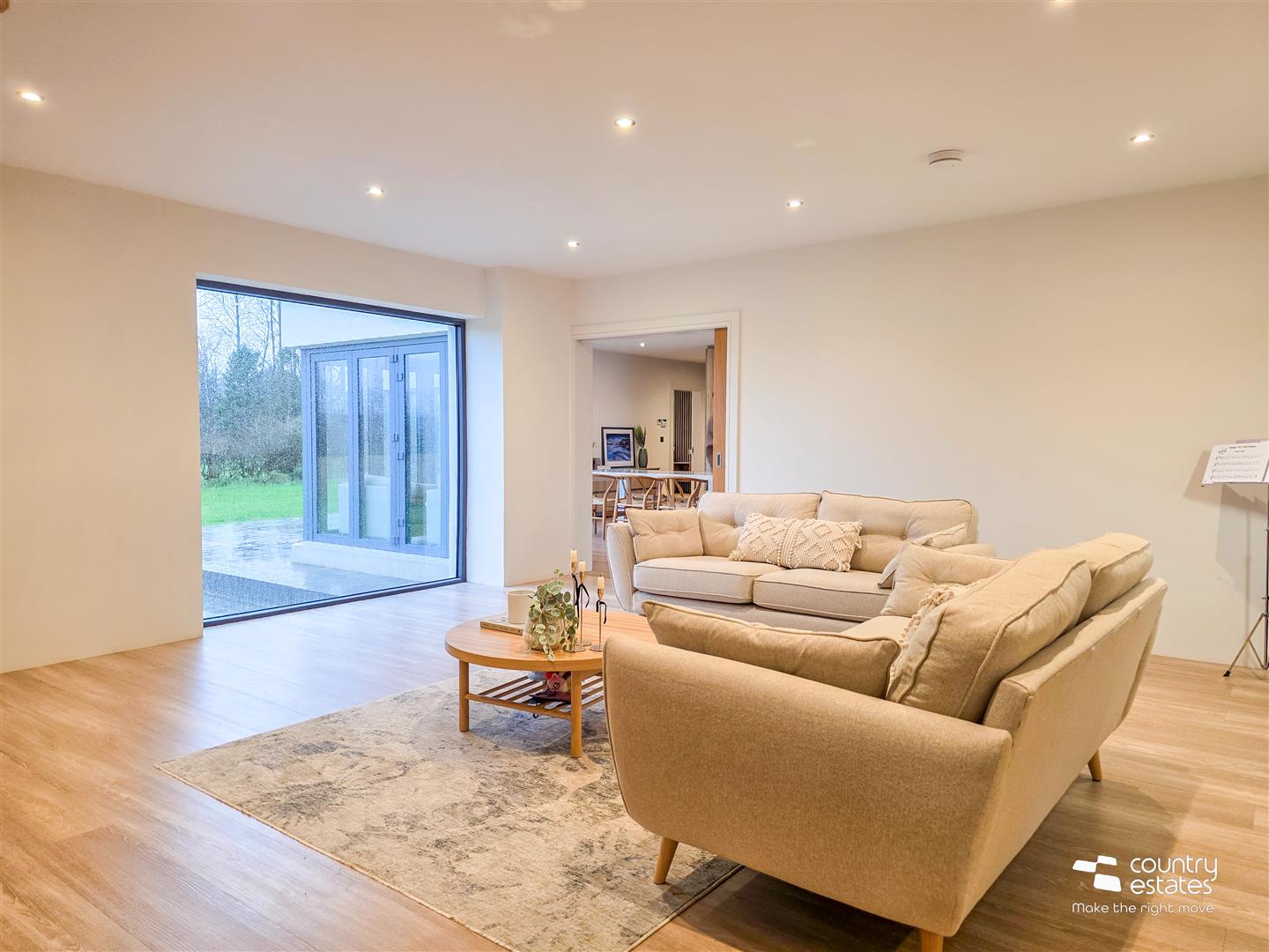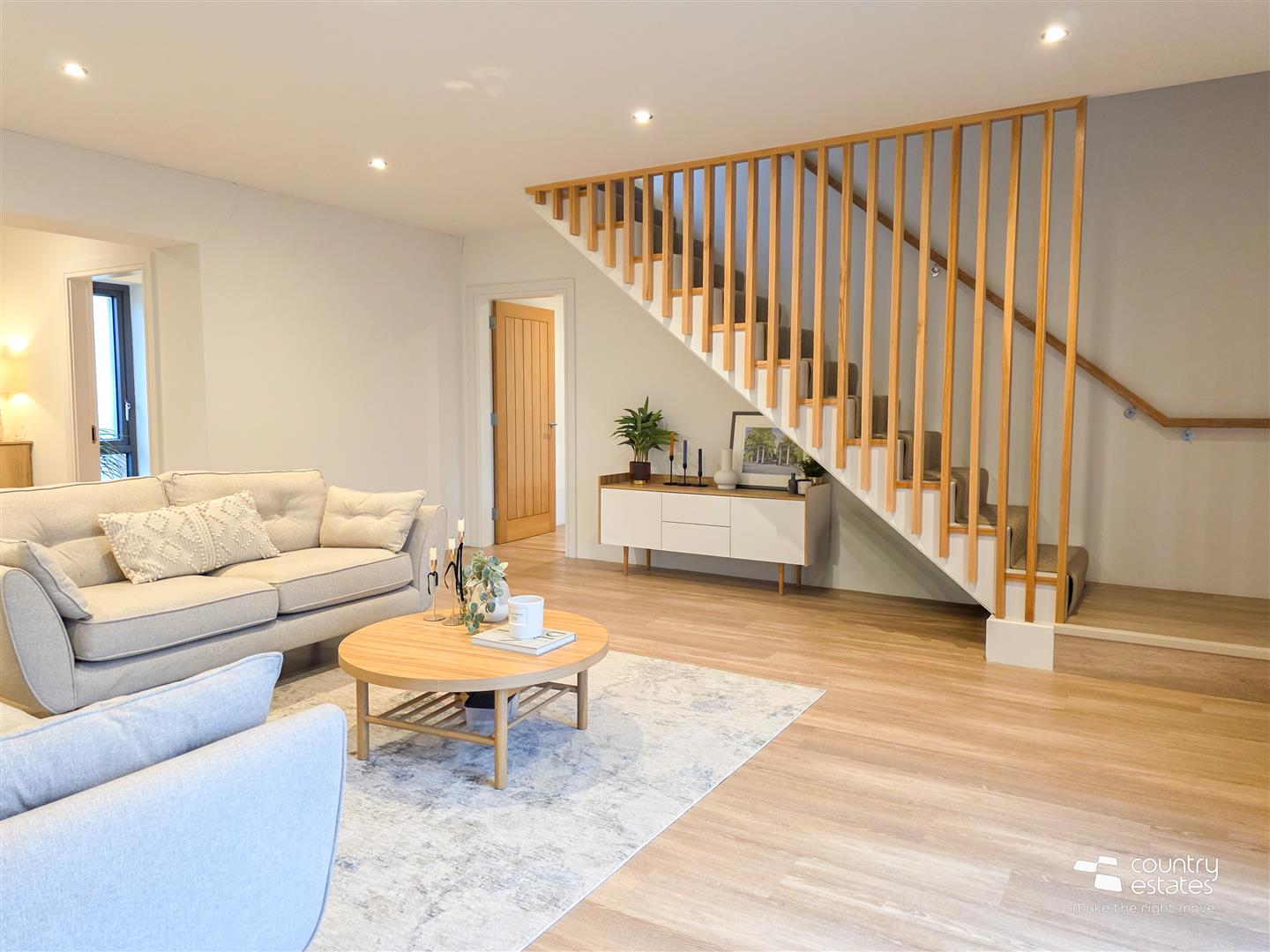 Full height square picture window with views over garden. Staircase to first floor with feature slatted stairwell. Recessed Low voltage lighting. Sliding pocket door into Open plan Kitchen / Living / Dining Room.