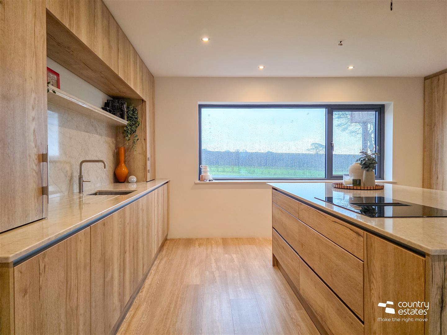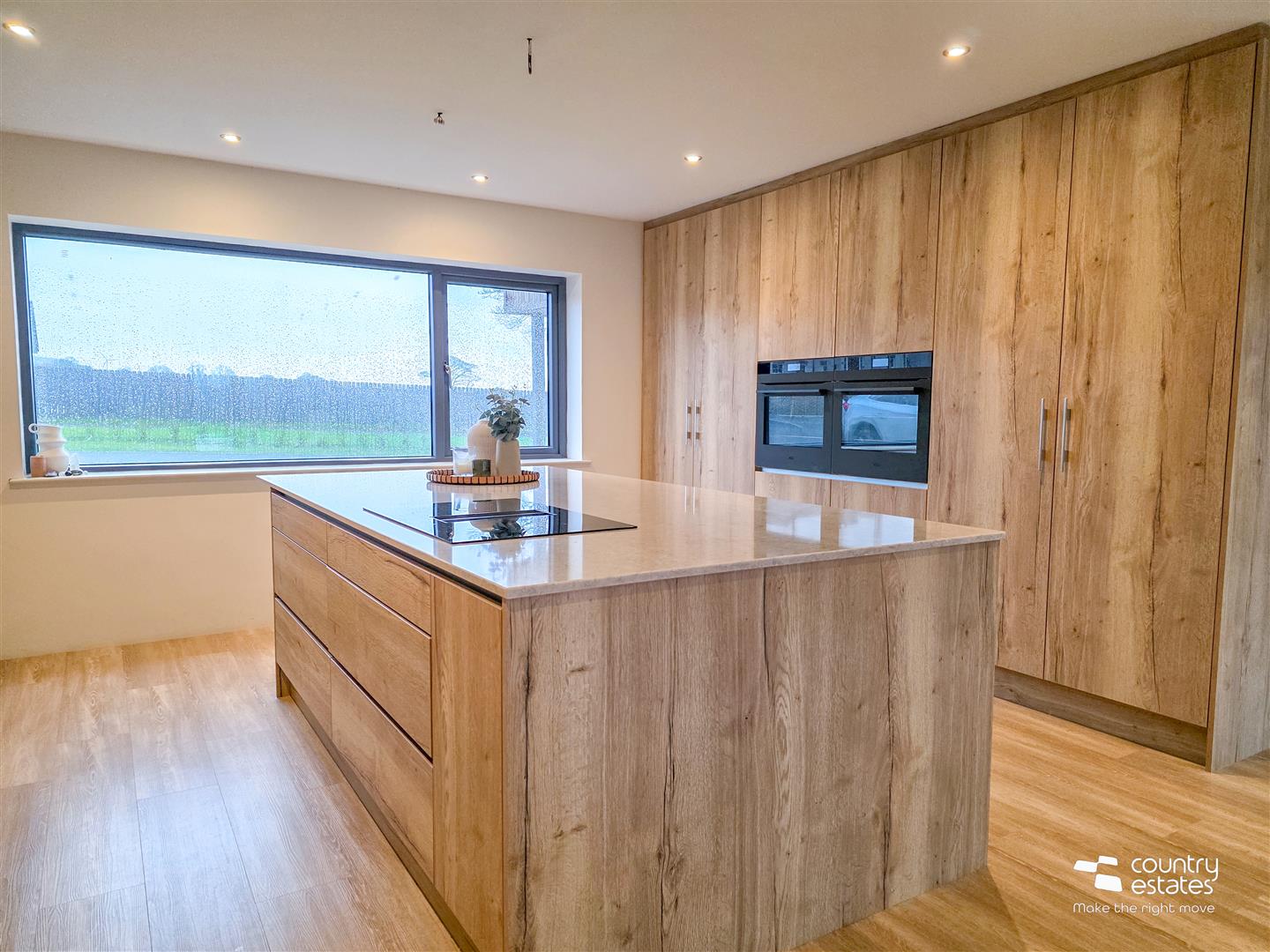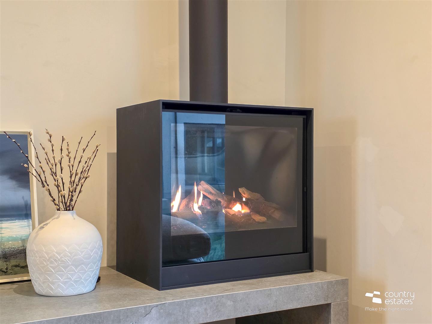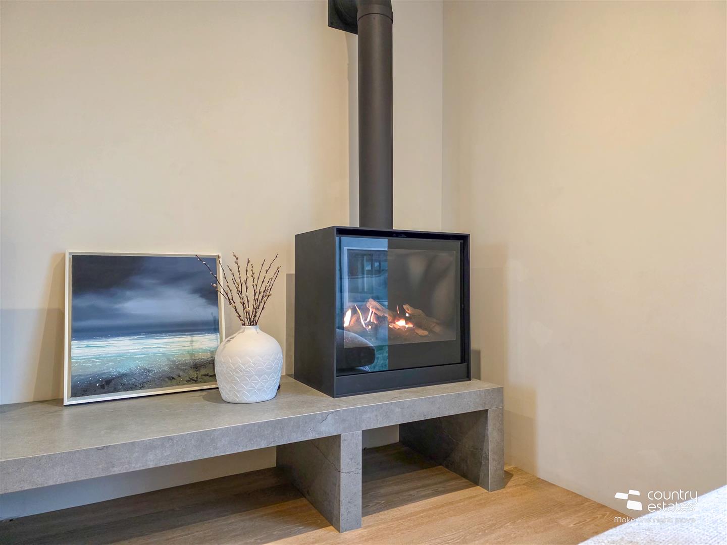 Dual window aspect with full height square picture window enjoying views over garden and full height window. Attractive modern Dekton modern raised fireplace with box bell gas fire. Recessed low voltage lighting.