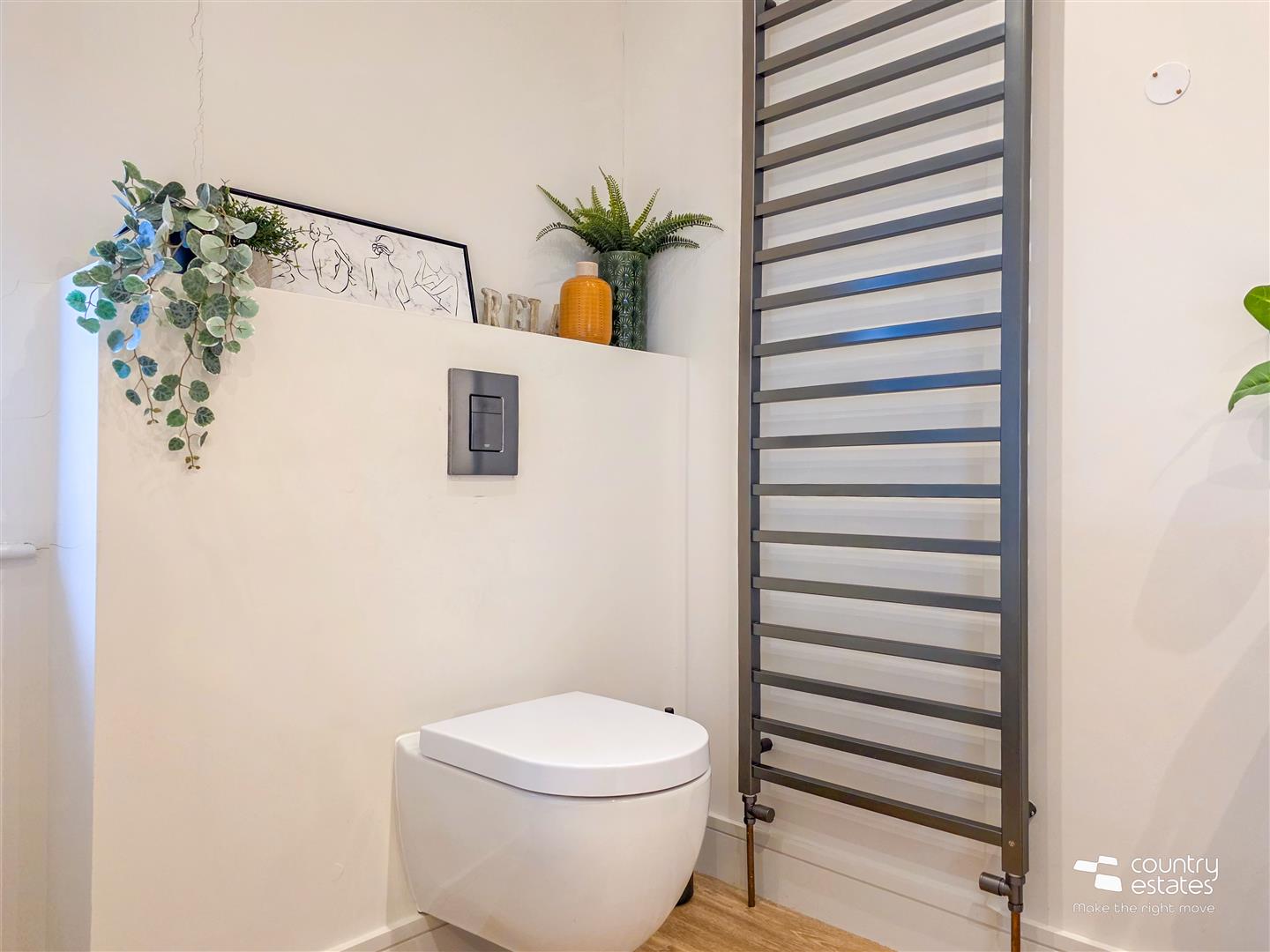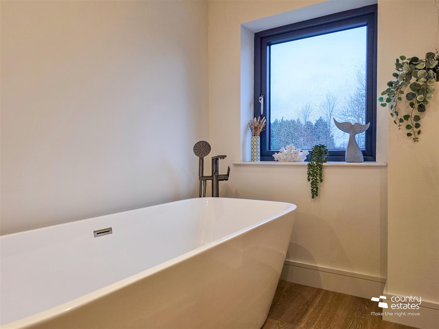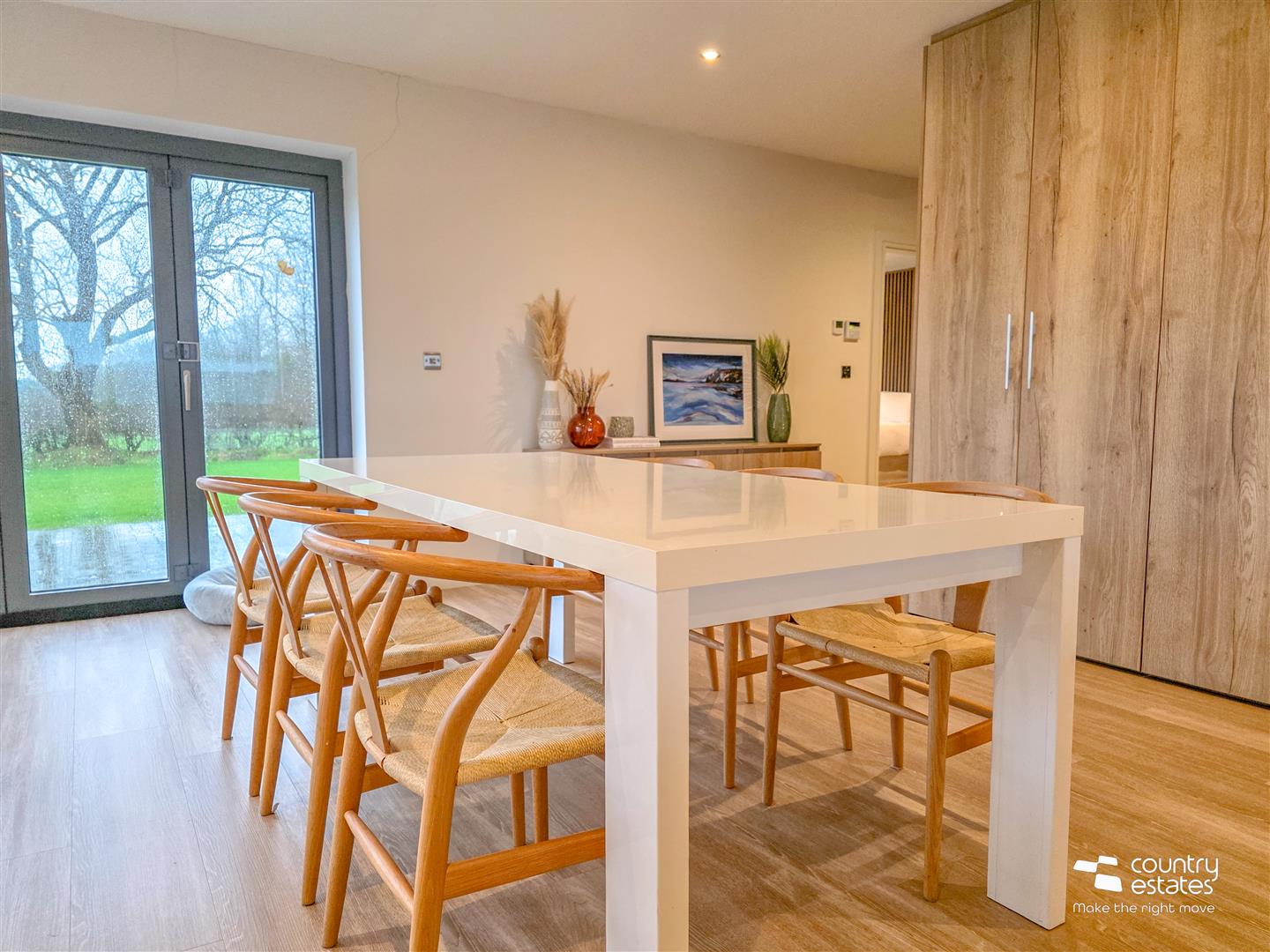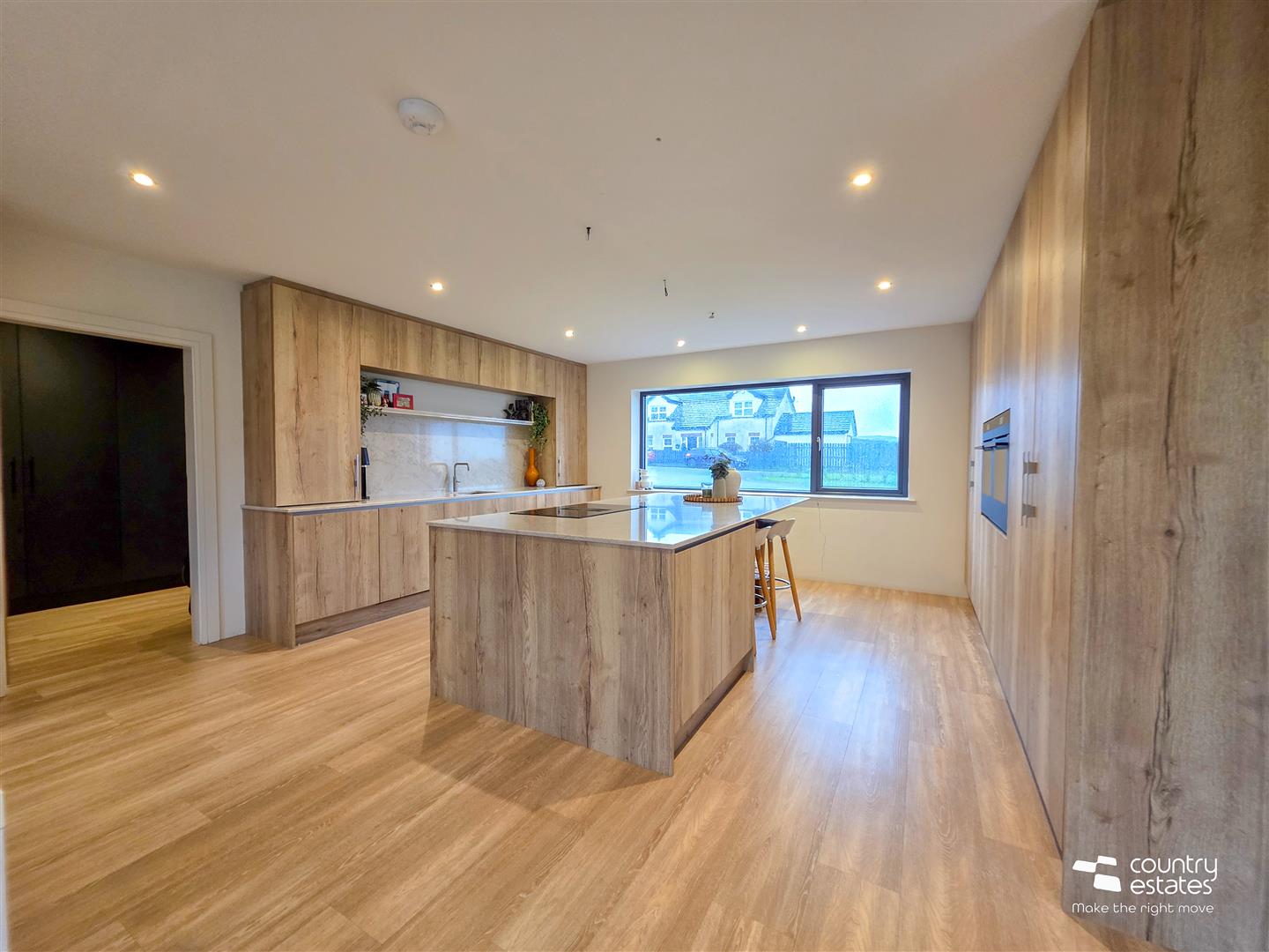 Dual window aspect with full height square picture window enjoying views over garden and full height window. Attractive modern Dekton modern raised fireplace with box bell gas fire. Recessed low voltage lighting.