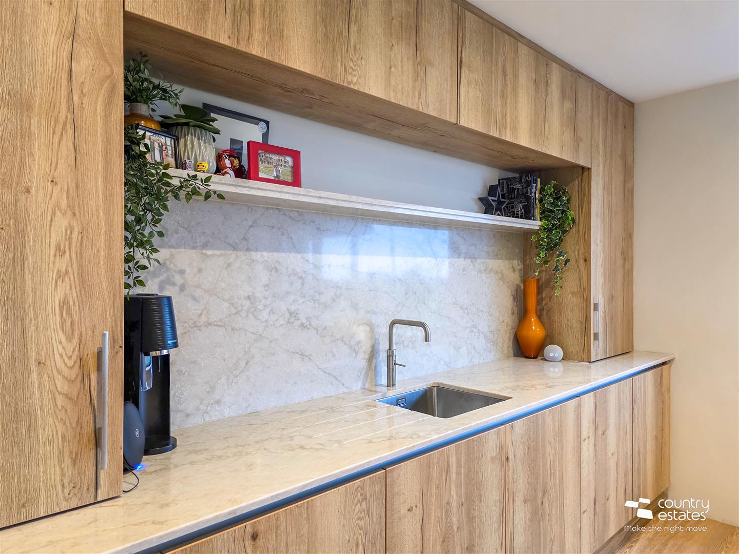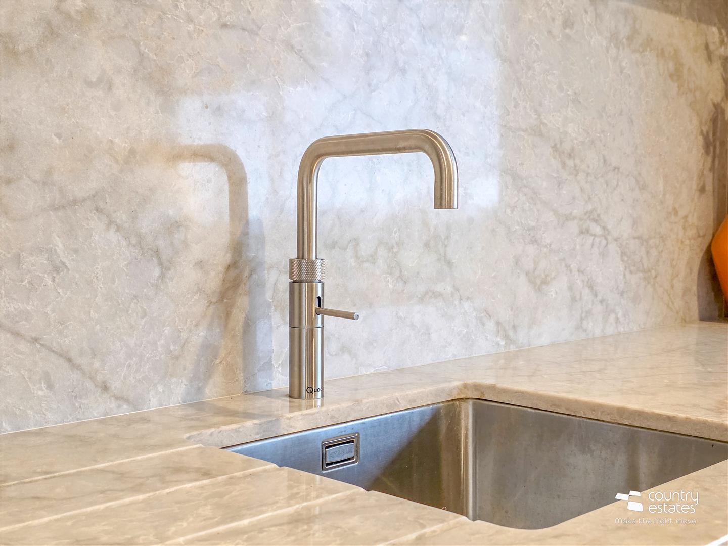 Designed and supplied by Johanna Montgomery designs Limited. Equipped with a comprehensive range of bespoke fitted high and low level solid natural oak fitted units with contrasting quality marbled granite work surfaces and splashback. Inlaid stainless steel sink unit with Quooker hot tap. Fixed centre island with contrasting marble worksurfaces with breakfast bar style return for casual dining. Inset 4 ring venting induction hob. A host of integrated appliances including twin eye level, AEG ovens, twin dishwashers and full height fridge freezers. Bespoke fitted larder cupboard. Bespoke fitted full height drinks cupboard with open box display shelving fitted drawers and wine rack. Living / dining area with twin bi-folding doors opening onto patio and private gardens. Recessed Low voltage lighting.