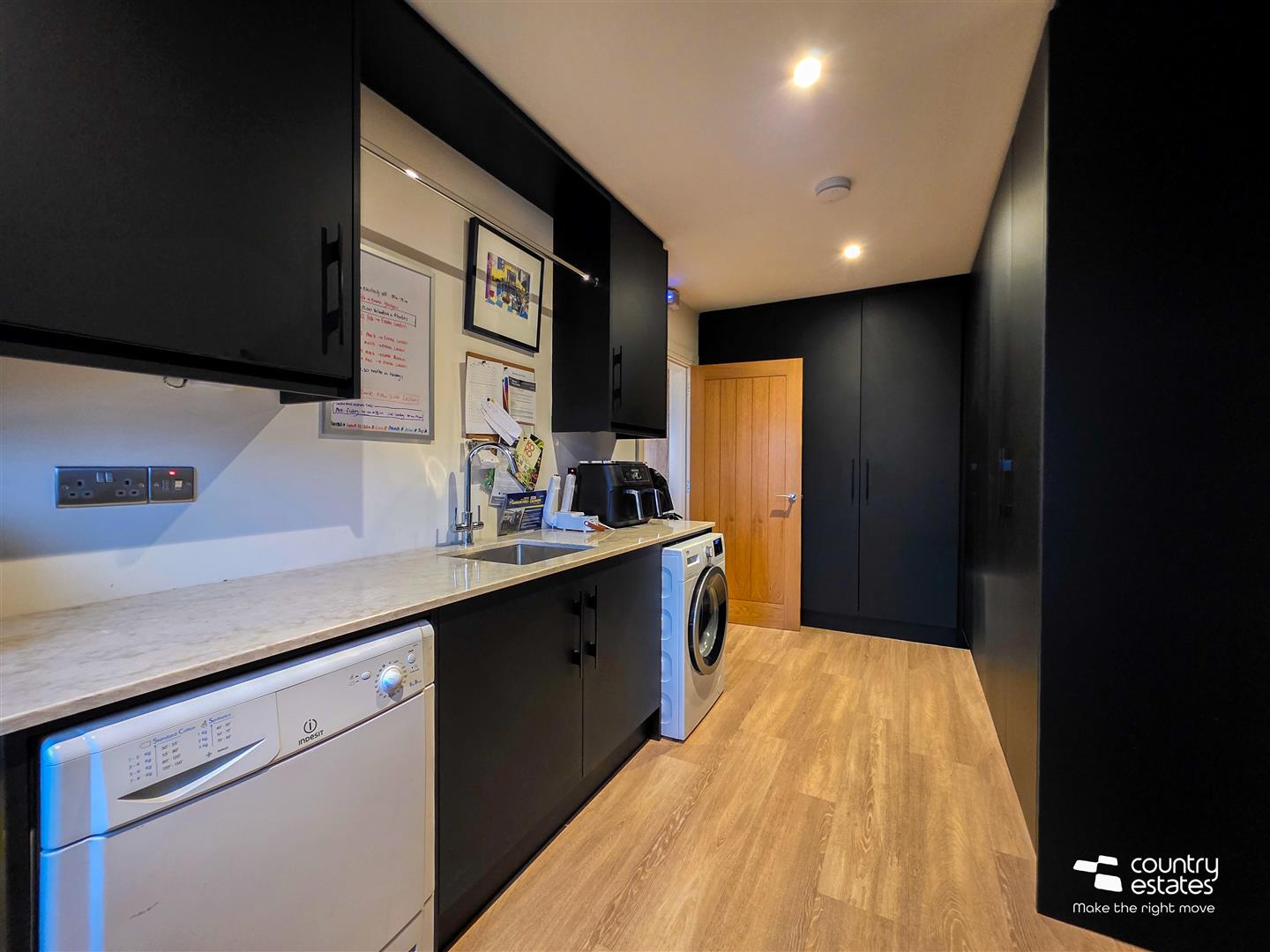 Designed and supplied by Johanna Montgomery. Bespoke fitted L shape full height storage cupboards in Matt Black finish. Range of high and low level modern kitchen units in matching Matt Black finish with contrasting marbled granite worksurfaces. Inlaid stainless steel sink unit with swan neck mixer tap. Fixed Bench seating with open under storage bays and coat hooks. Recessed Low voltage lighting. External door to side.