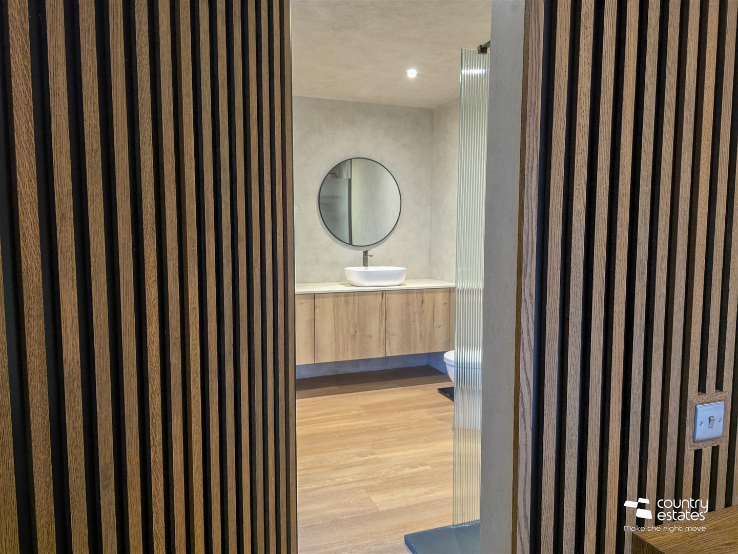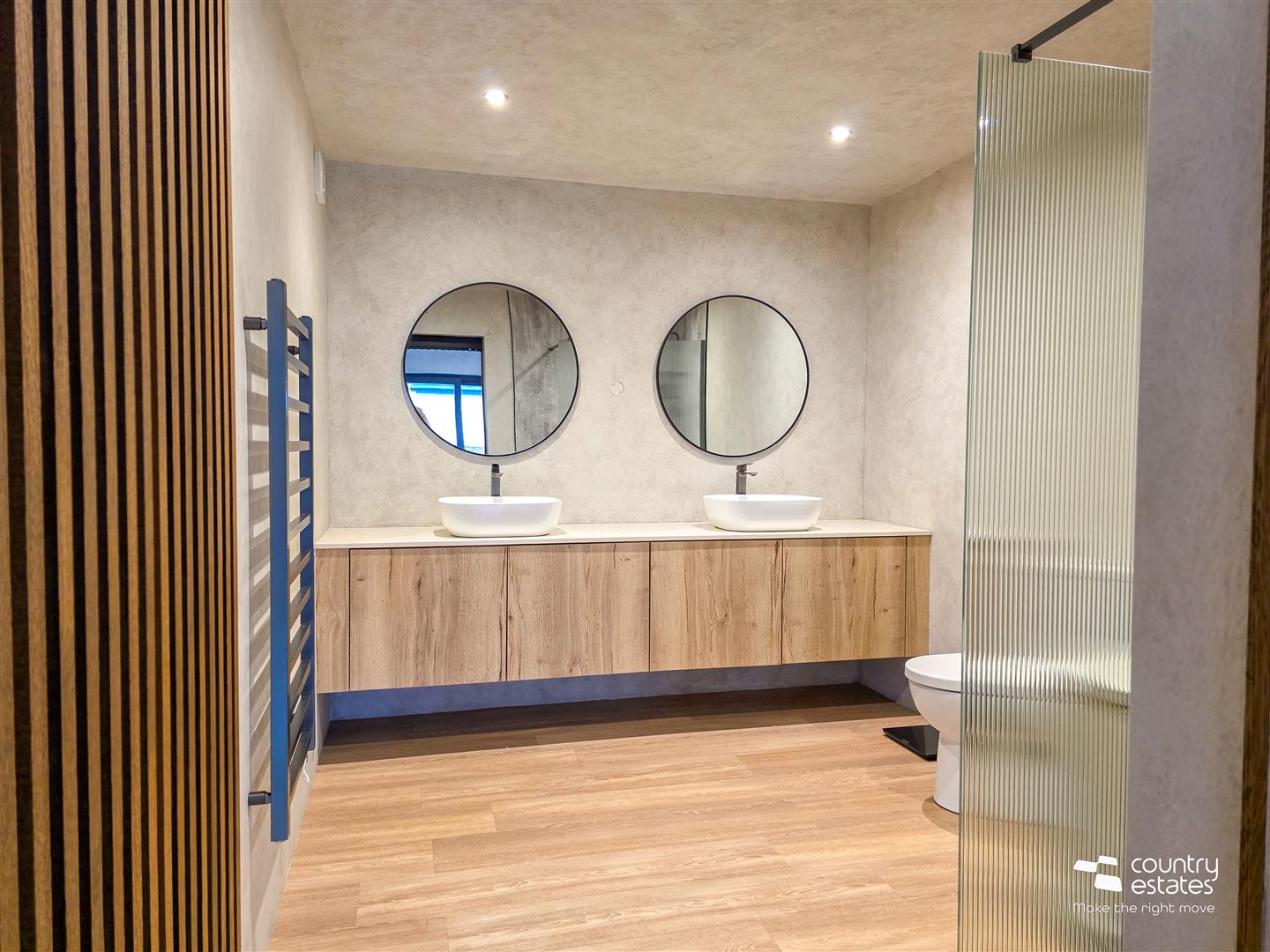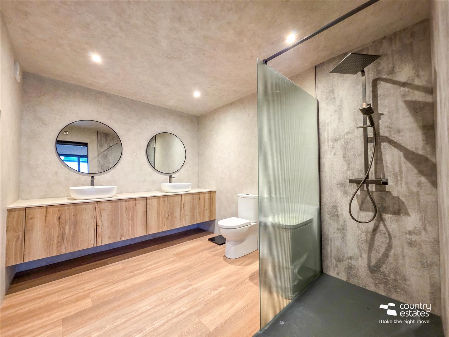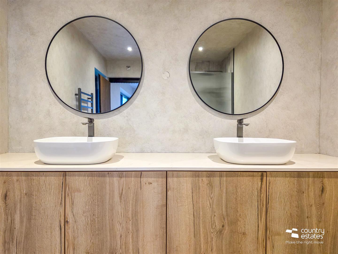 Twin 'his and her' sinks on floating wall to wall natural oak vanity unit, button flush w.c. and large open shower enclosure with full height shower screen in ribbon glass with Drench style shower and hand shower attachment. Recessed low voltage lighting.
