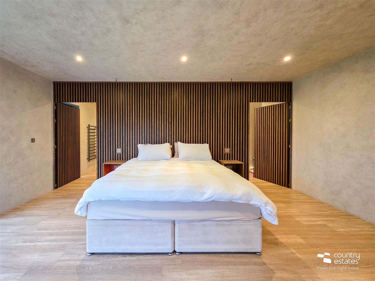 With feature corner full height window with sliding matching patio door opening out to mature gardens and patio. Feature acoustic slatted panelled accent wall with concealed dressing room and ensuite entrances. Walls finished in 'Soap Stone' colour in french wash finish. Recessed low voltage lighting.