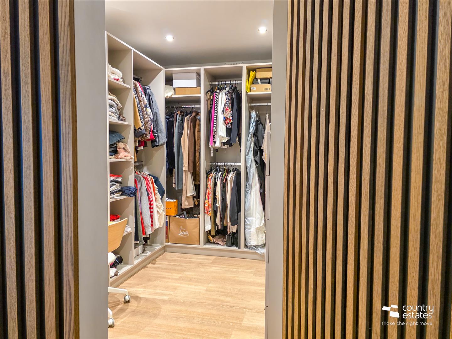 Comprehensively fitted with a bespoke range of integrated hanging space open shelving and fitted drawers. Recessed low voltage lighting.