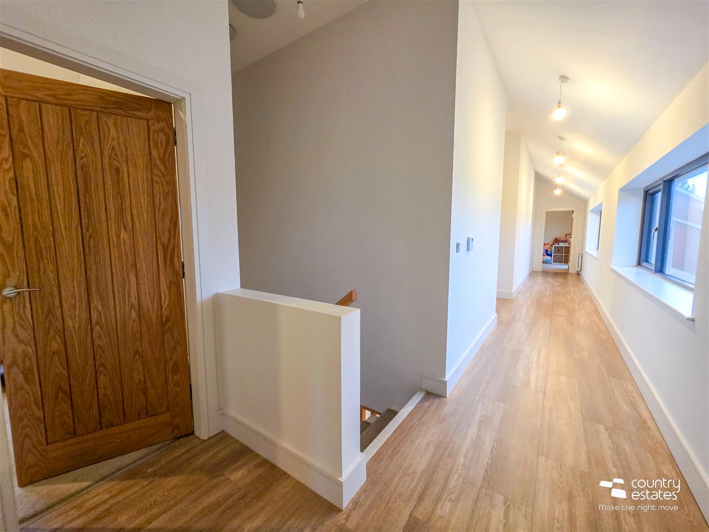 Quality Karndean `natural oak´ coloured flooring extending through entire ground floor level with underfloor heating. Fixed bespoke fitted wall to wall solid oak low level storage units. Open plan into lounge.