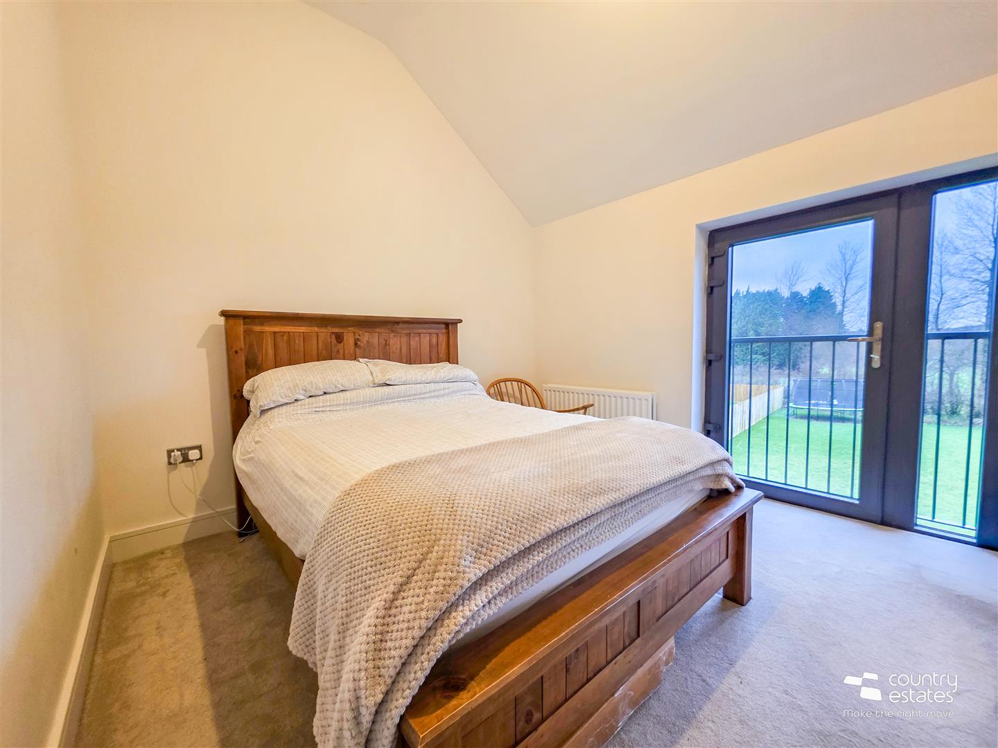 Built in full height oak double wardrobes with matching writing desk. Full height PVC double glazed door with guard rail lean to balcony railing.
