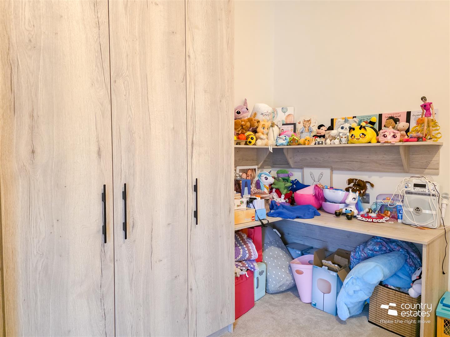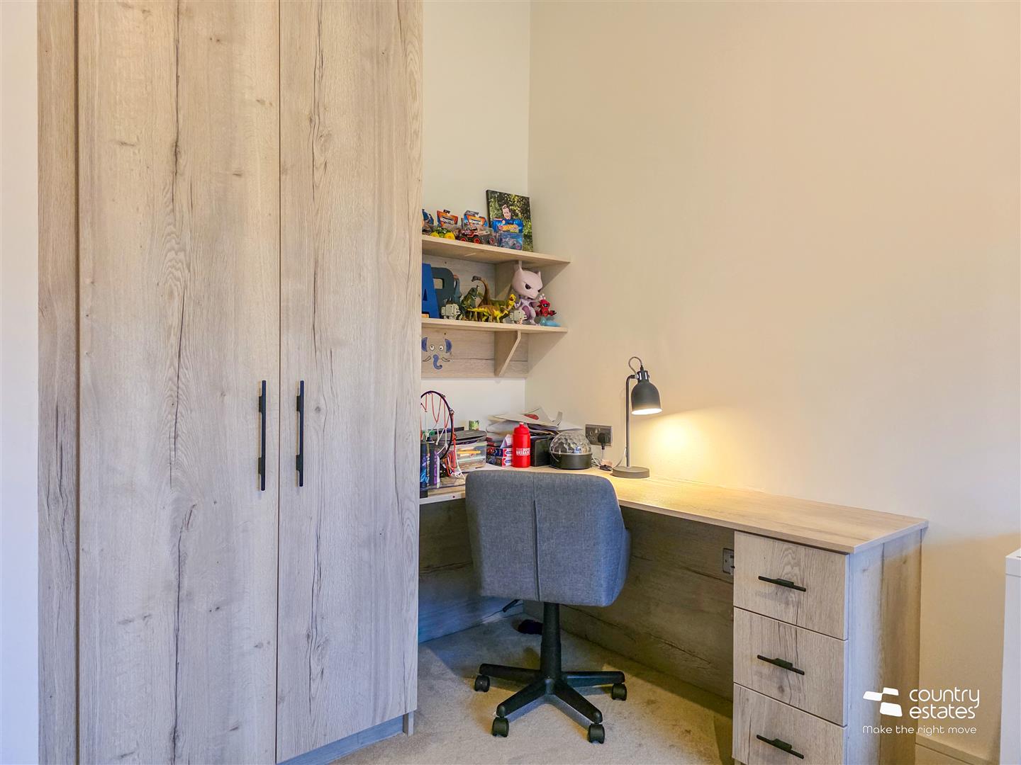 At max. Built in full height oak double wardrobe with matching writing desk. Views over a garden and golf course.