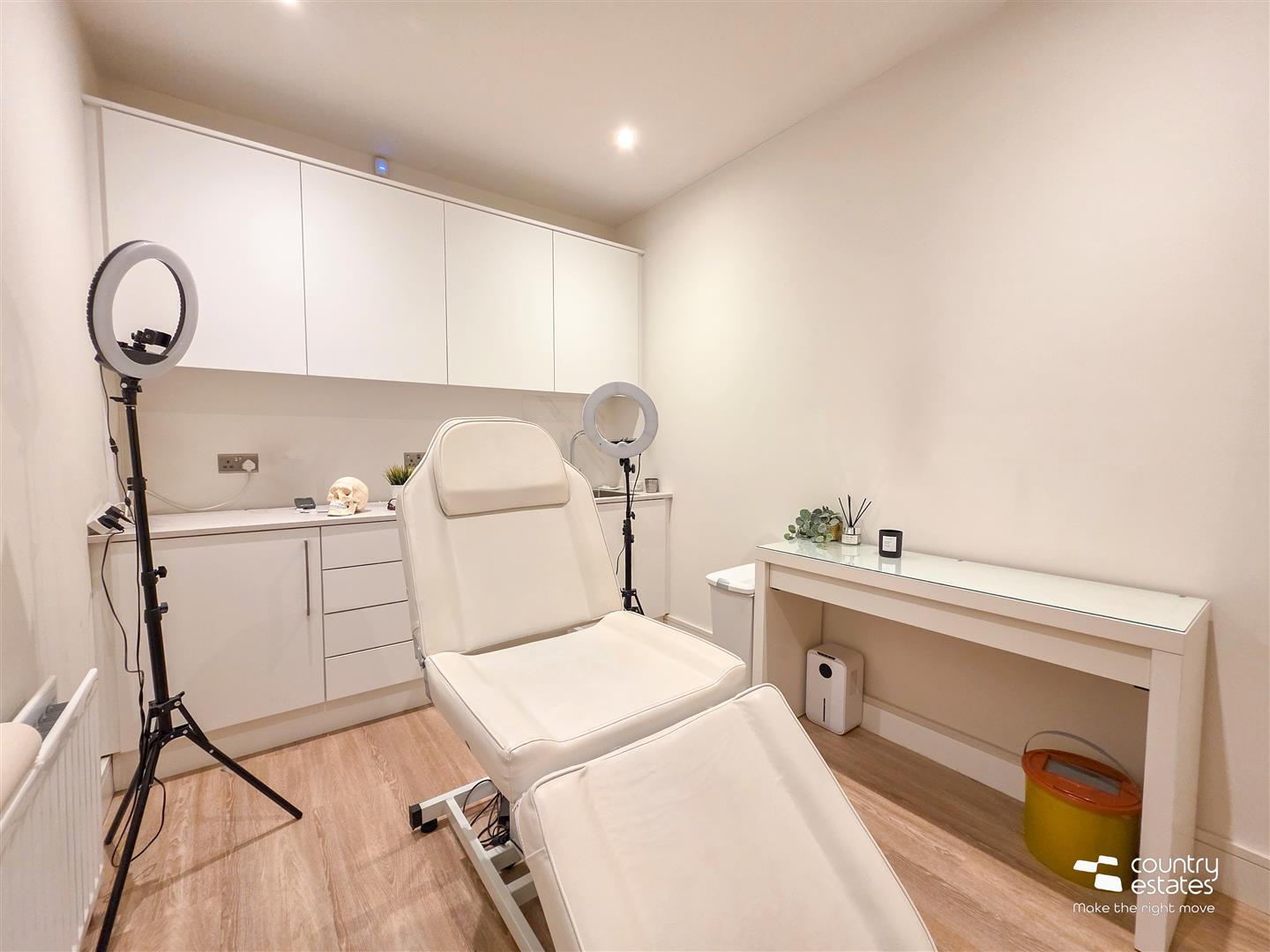 Accessed to side via composite door. Reception Lobby area 9'0" X 4'3" with feature acoustic panelled accent wall and bench seating. Open plan into studio area with power, light and heat. Range of wall to wall fitted modern storage units. Perfect space for a variety of uses such as home office/ physio etc.
