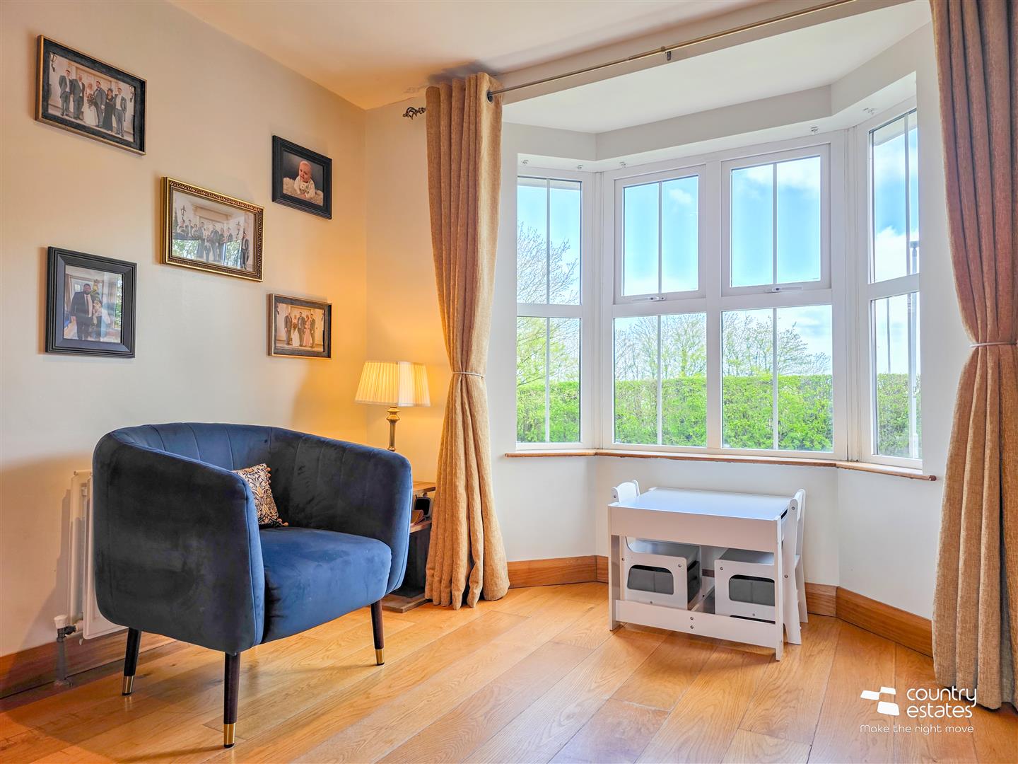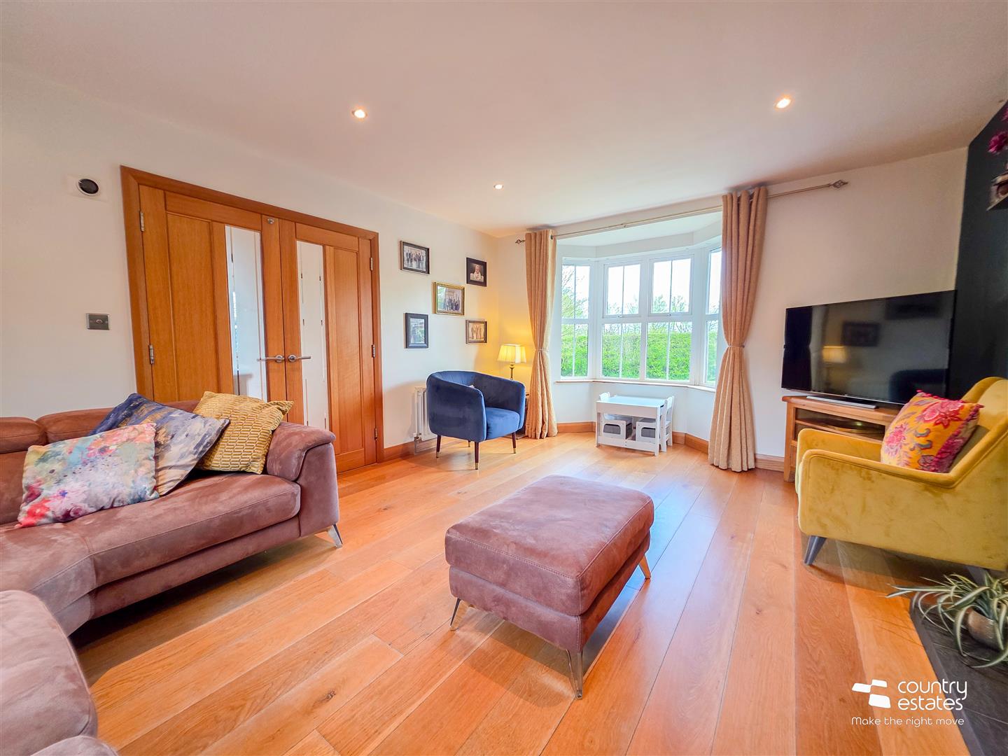 Attractive feature cast iron horseshoe fireplace with slate hearth. Hard wood flooring. Feature bow window. Recessed downlighting.