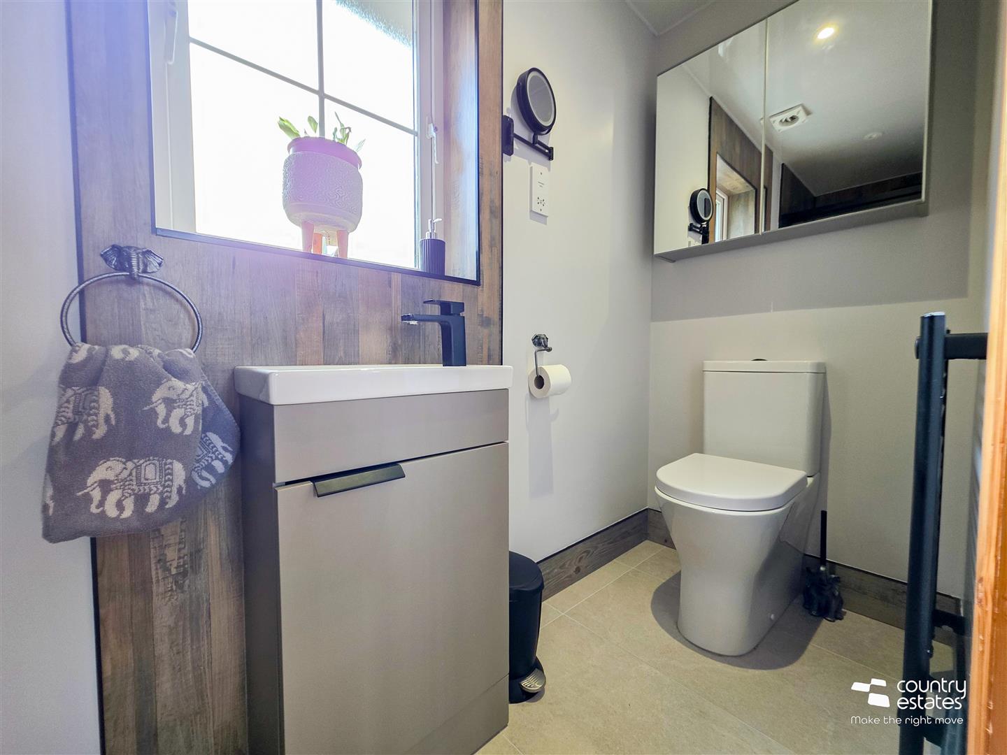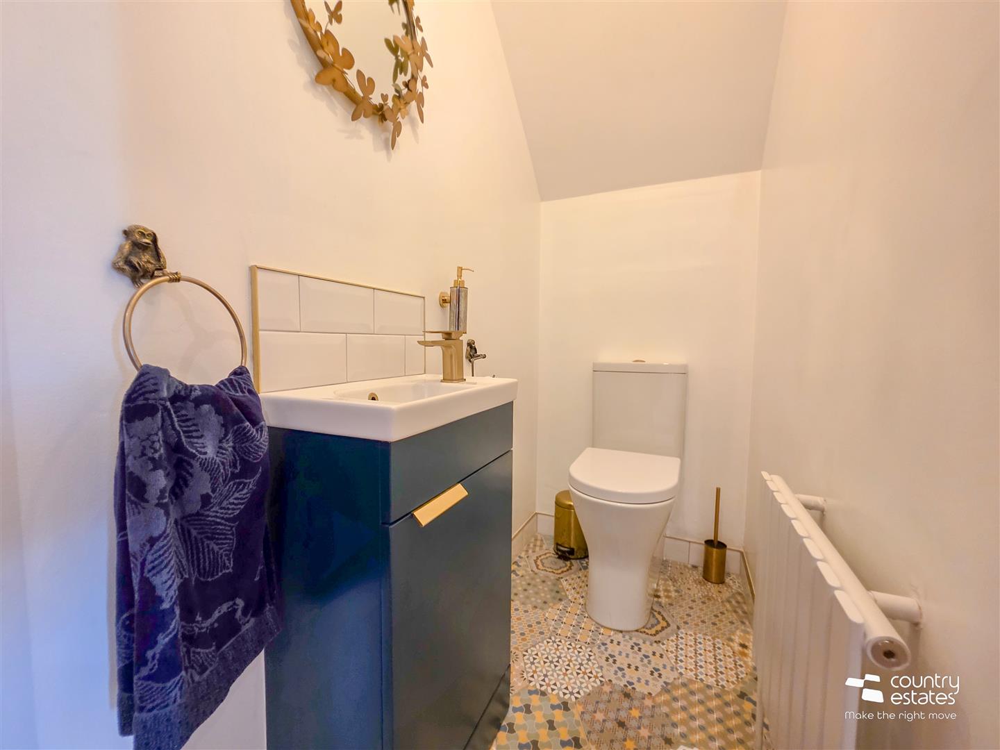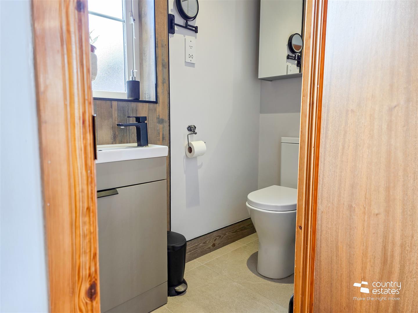 Comprising vanity wash hand basin with monobloc tap, and a button flush WC. Tiled floor.