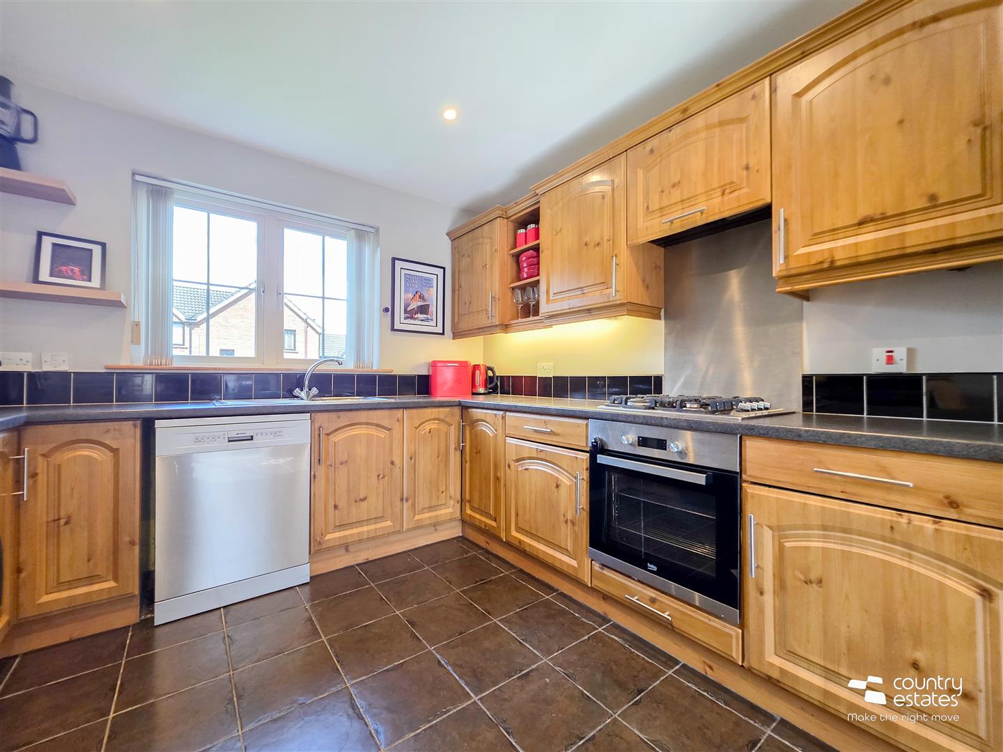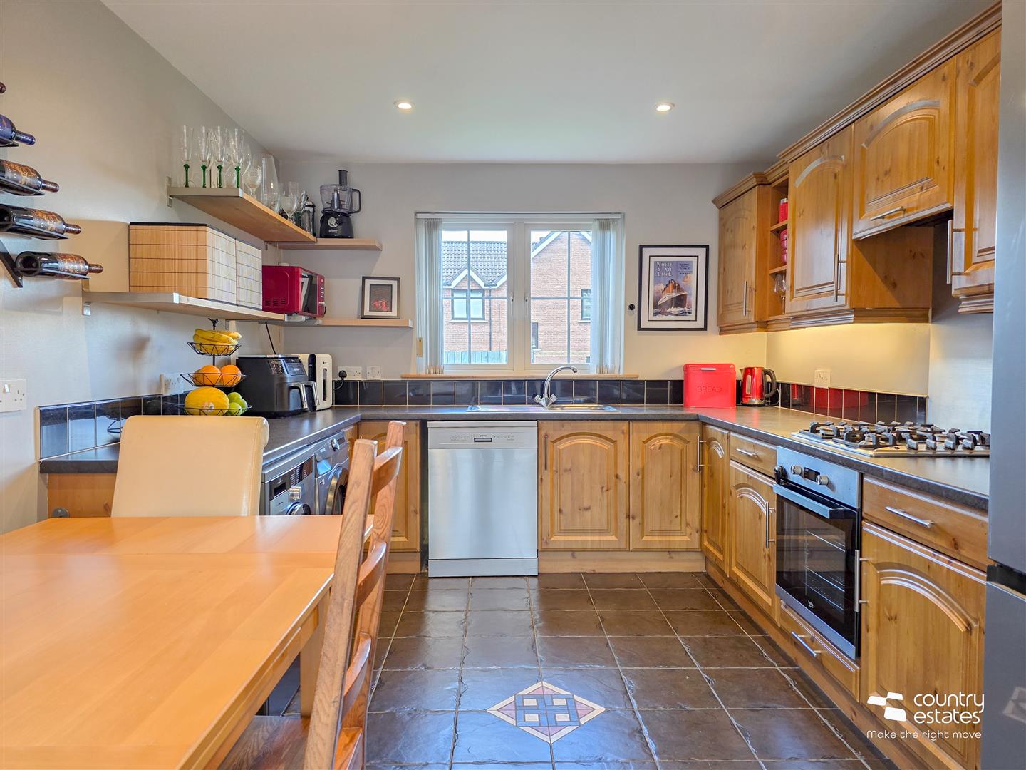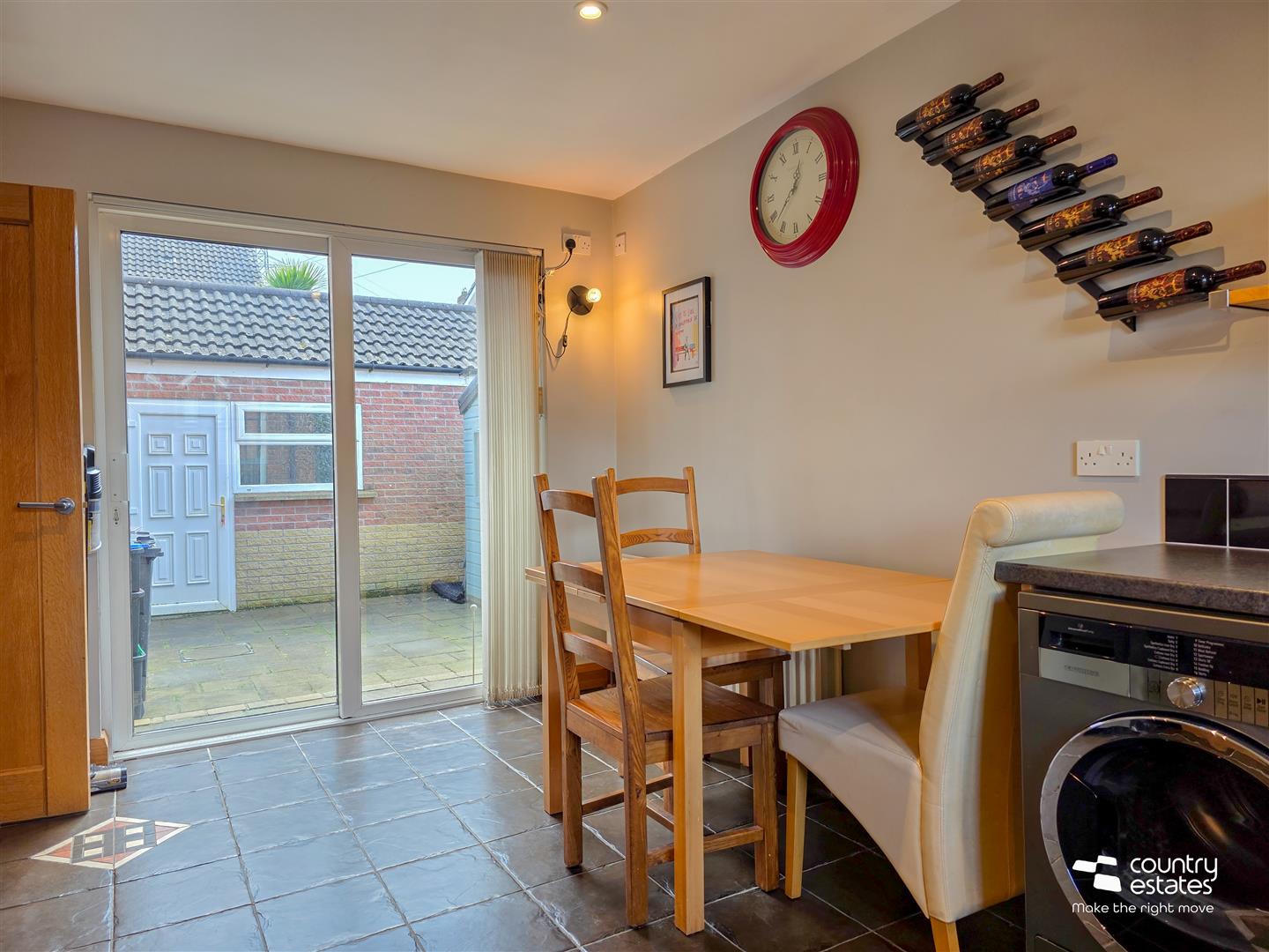 Equipped with a comprehensive range of high and low level shaker style fitted units and contrasting work surfaces. Single drainer stainless steel sink unit with mixer tap. Integrated oven with separate four ring gas hob and over head extractor fan in pull out hood. Plumbed for washing machine. Space for tumble dryer. Space for free standing fridge freezer. Tiled splashbacks. Tiled floor. Sliding door in aluminium frame to rear patio.