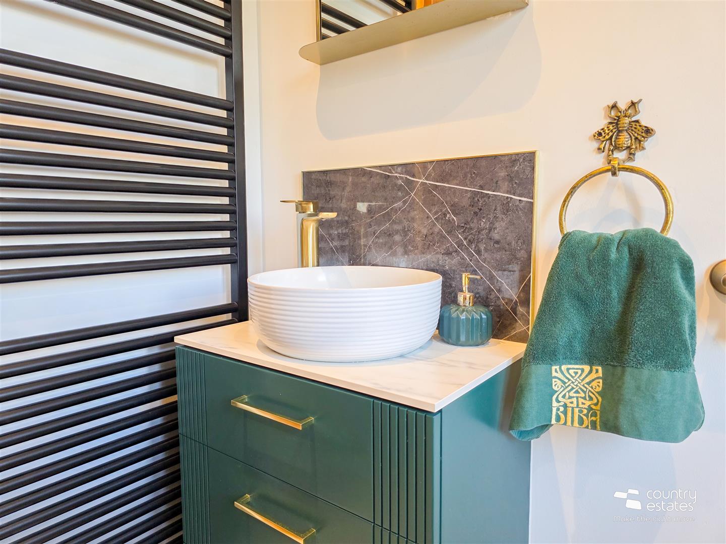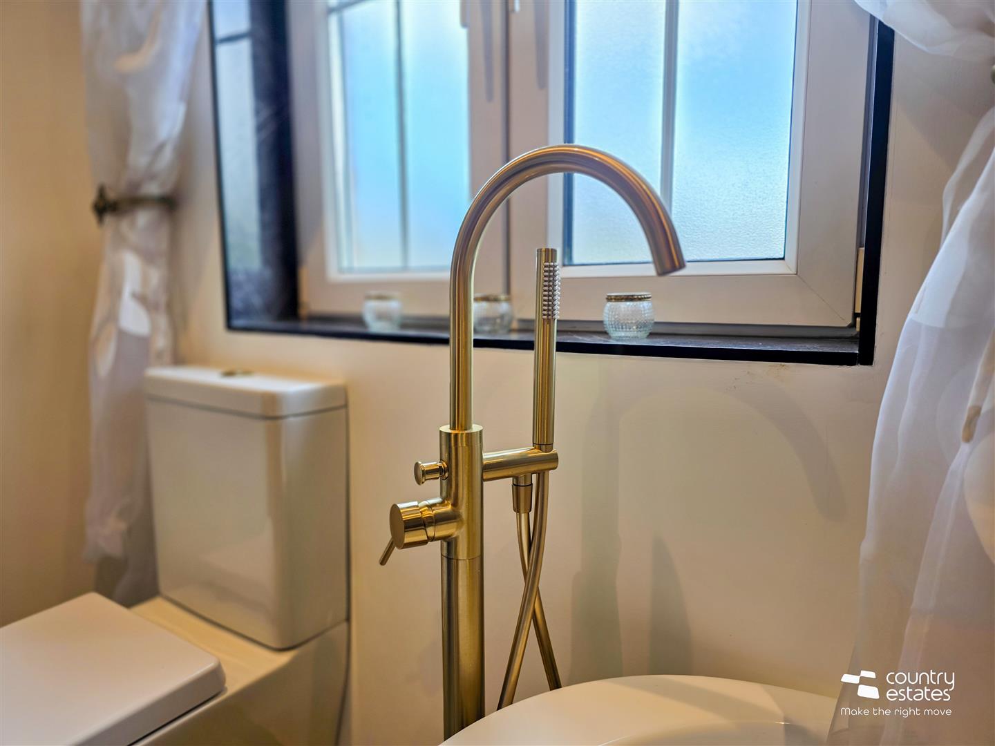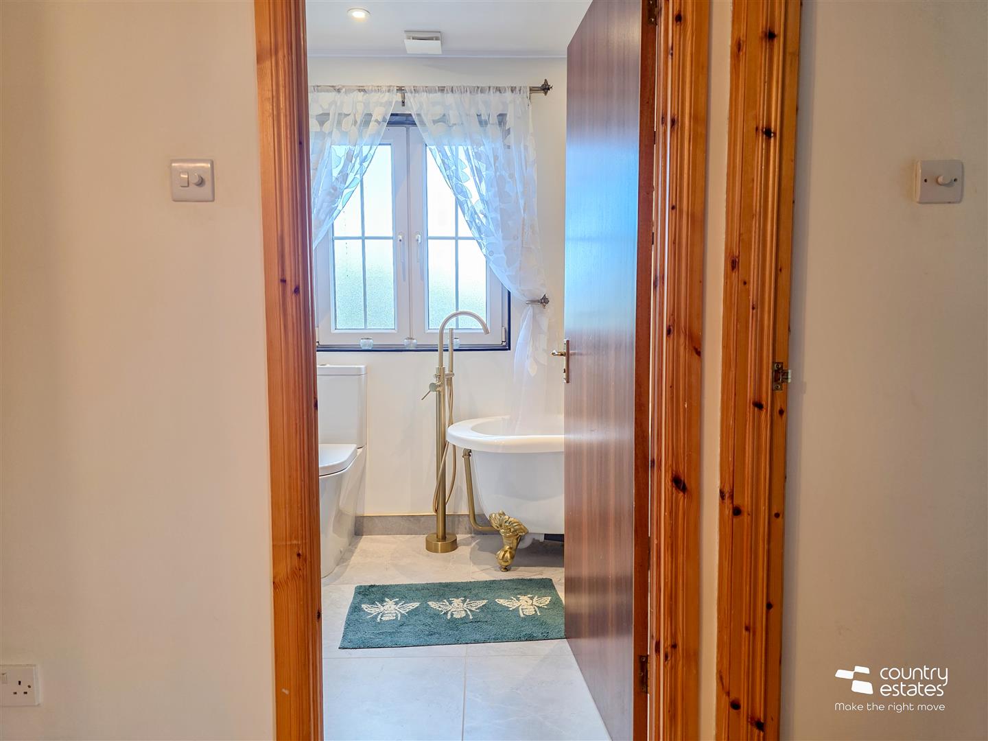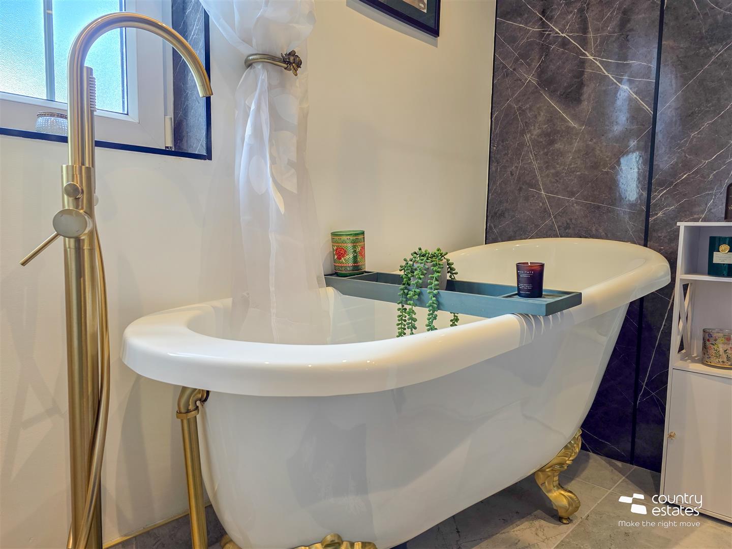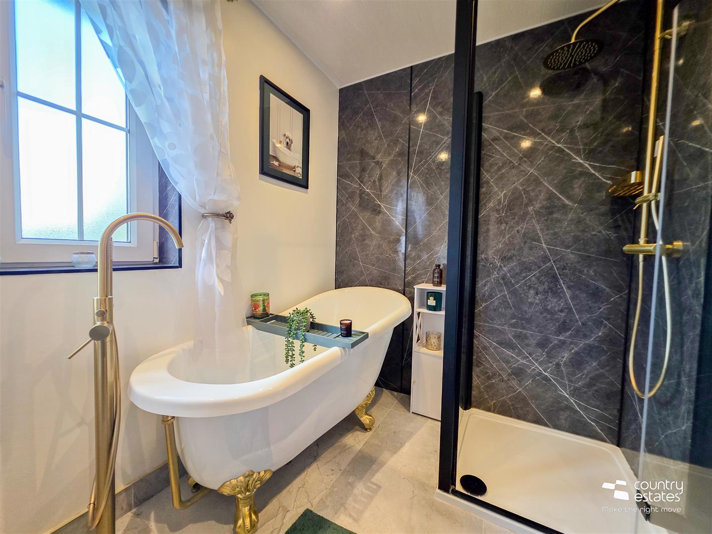 Comprising Free standing claw foot bath with floor mounted tap and hand shower attachment, PVC panelled shower cubicle with thermostatically controlled drench style shower and hand shower attachment, vanity unit with top mounted wash hand basin and monobloc tap and a button flush WC. Tiled floor. Recessed down lighting.