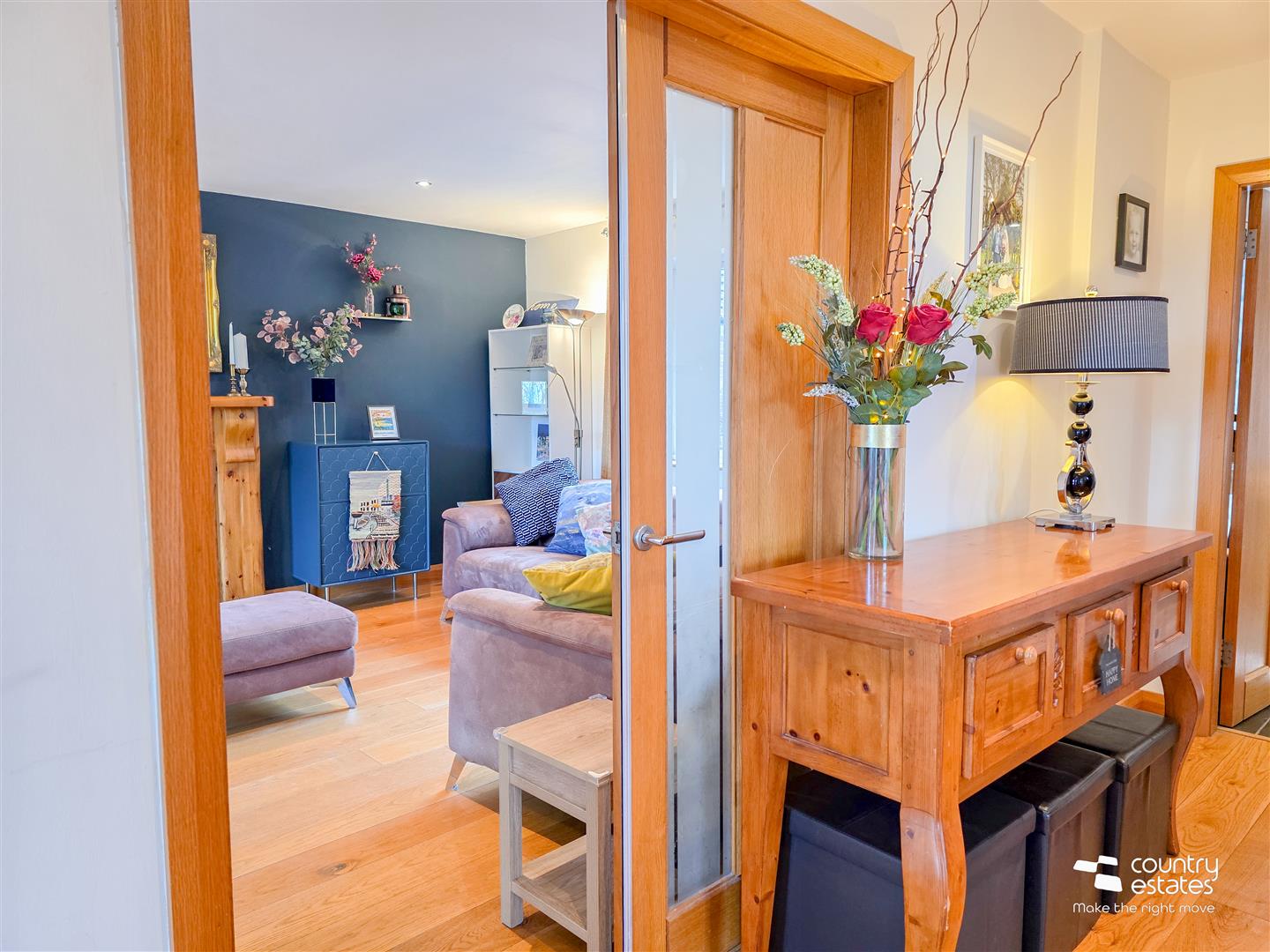 PVC Double glazed front door with matching side screen into spacious well presented entrance hall. Hard wood flooring. French doors open into: