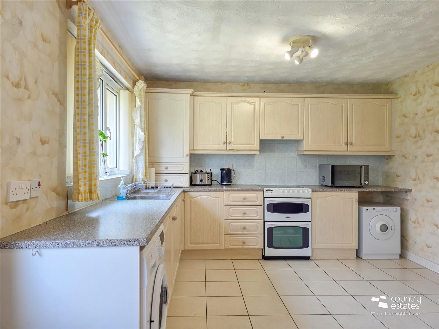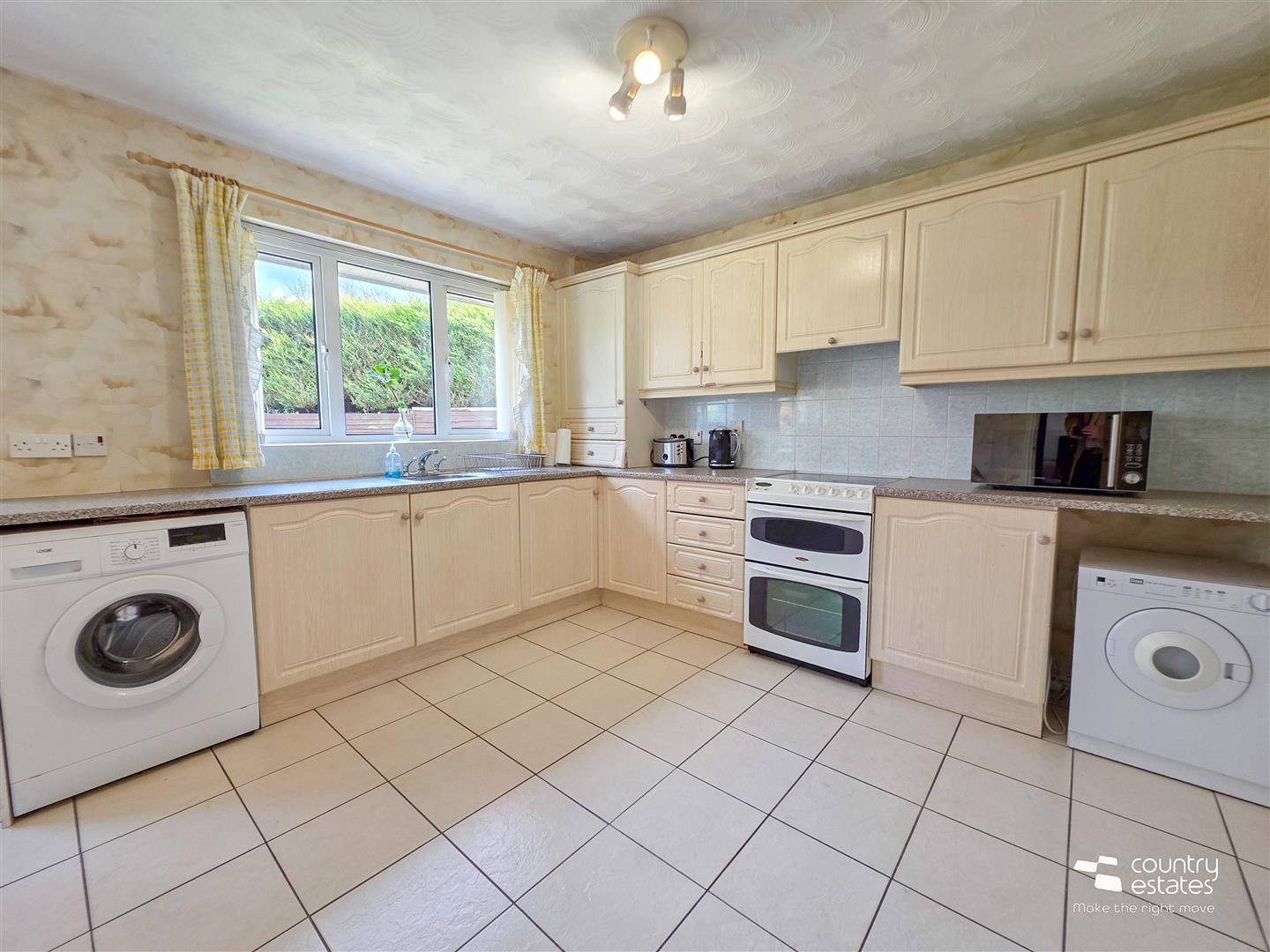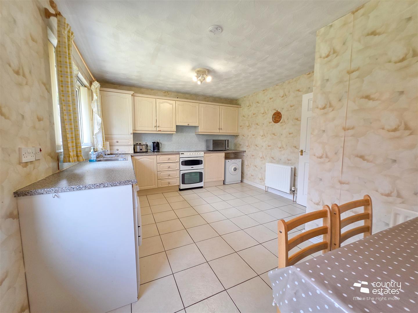 Equipped with a comprehensive range of high and low level fitted units and contrasting work surfaces. Single drainer stainless steel sink unit with mixer tap. Space for free standing oven with over head extractor fan in pull-out hood. Plumbed for washing machine. Space for tumble dryer. Part tiled walls. Tiled floor. Ample space for casual dining. PVC Double glazed door to rear garden.