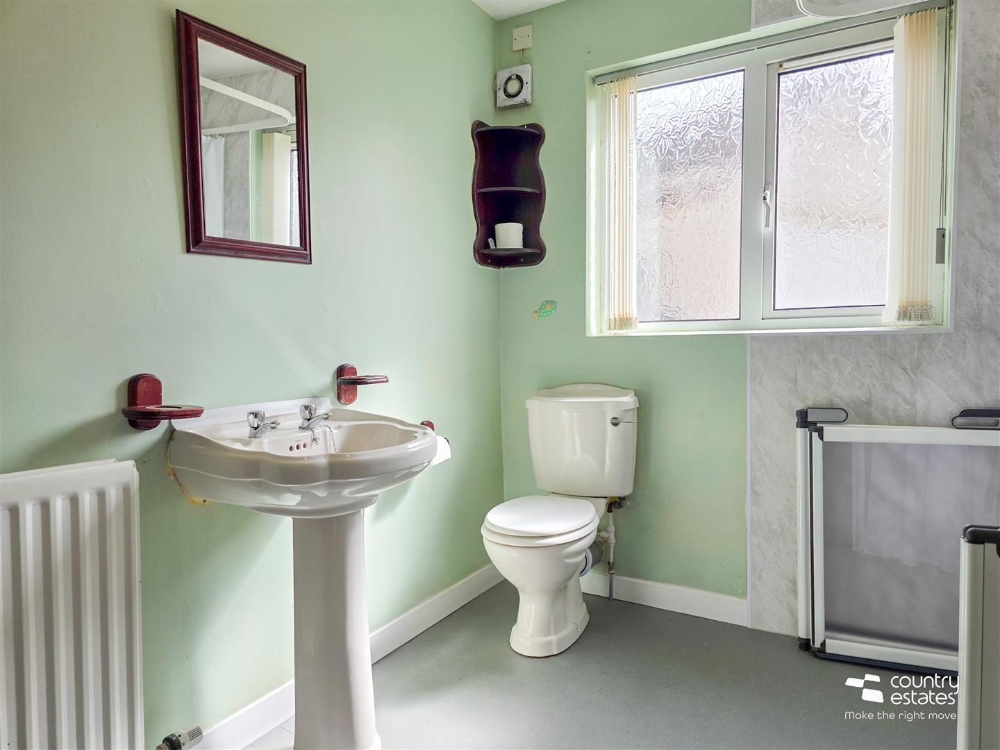 Comprising wet-room shower with thermostatically controlled shower unit, pedestal wash hand basin and a low flush WC. Partially PVC panelled walls.