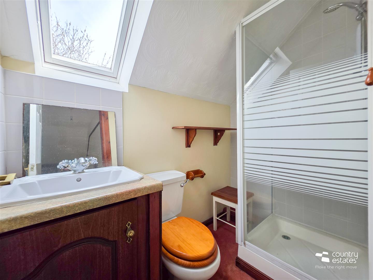 Comprising fully tiled shower cubicle with thermostatically controlled shower unit, vanity wash hand basin and a low flush WC. Tiled splash back. Velux window.