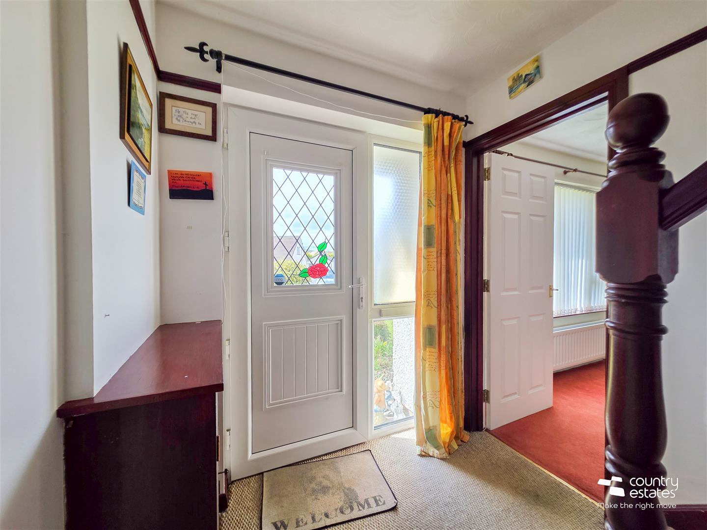 PVC double glazed front door with leaded glass inset and side screen into spacious entrance hall with under stairs storage cupboard.