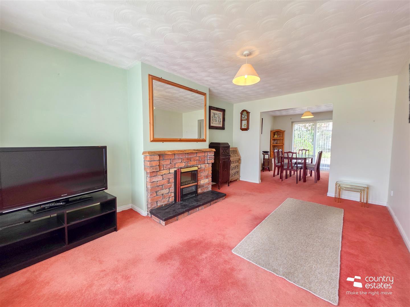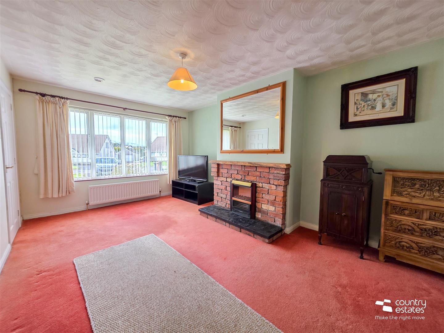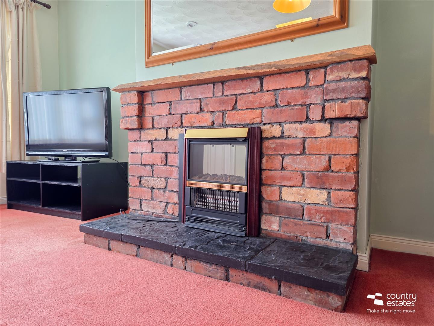 Attractive feature exposed brick fireplace with hard wood live edge mantle piece and inset electric fire. Picture style window. Open into:
