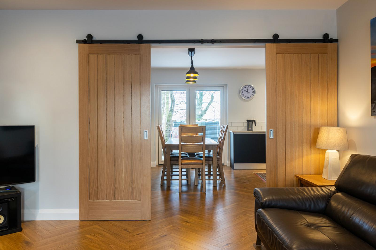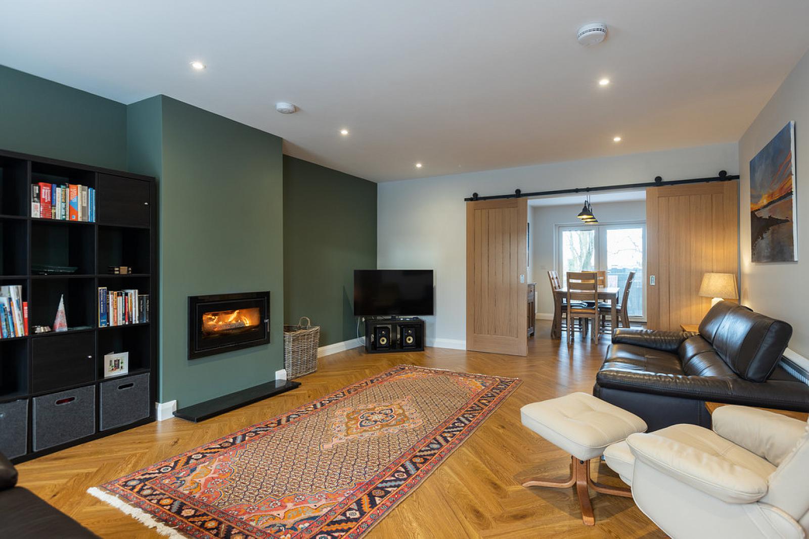 The ground floor accommodation is beautifully laid out with an open plan configuration. It comprises of a lounge with feature contemporary wood burning stove and sliding doors opening to the modern fully fitted kitchen and dining area with and range of integrated appliances plus a separate utility room off the kitchen.