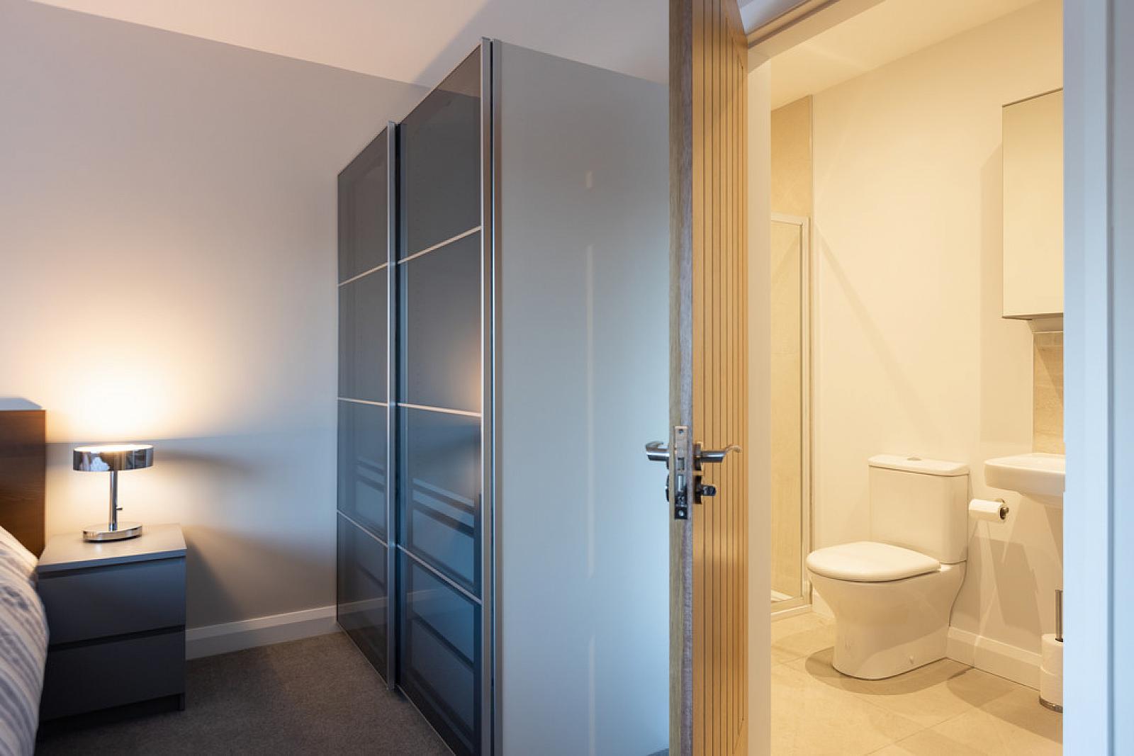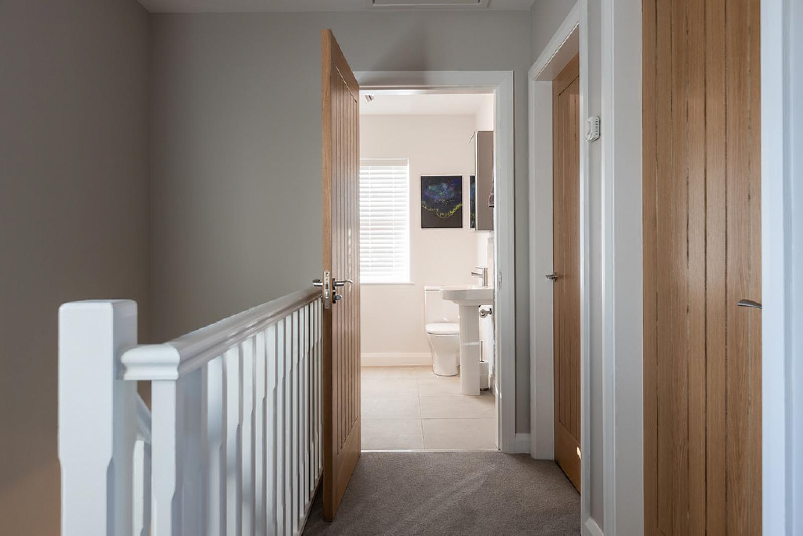 ENSUITE Suite comprising of enclosed shower cubicle, low flush WC, pedestal wash hand basin, stainless steel towel radiator, tiled splashback, tiled floor, extractor fan, recessed low voltage spotlights.