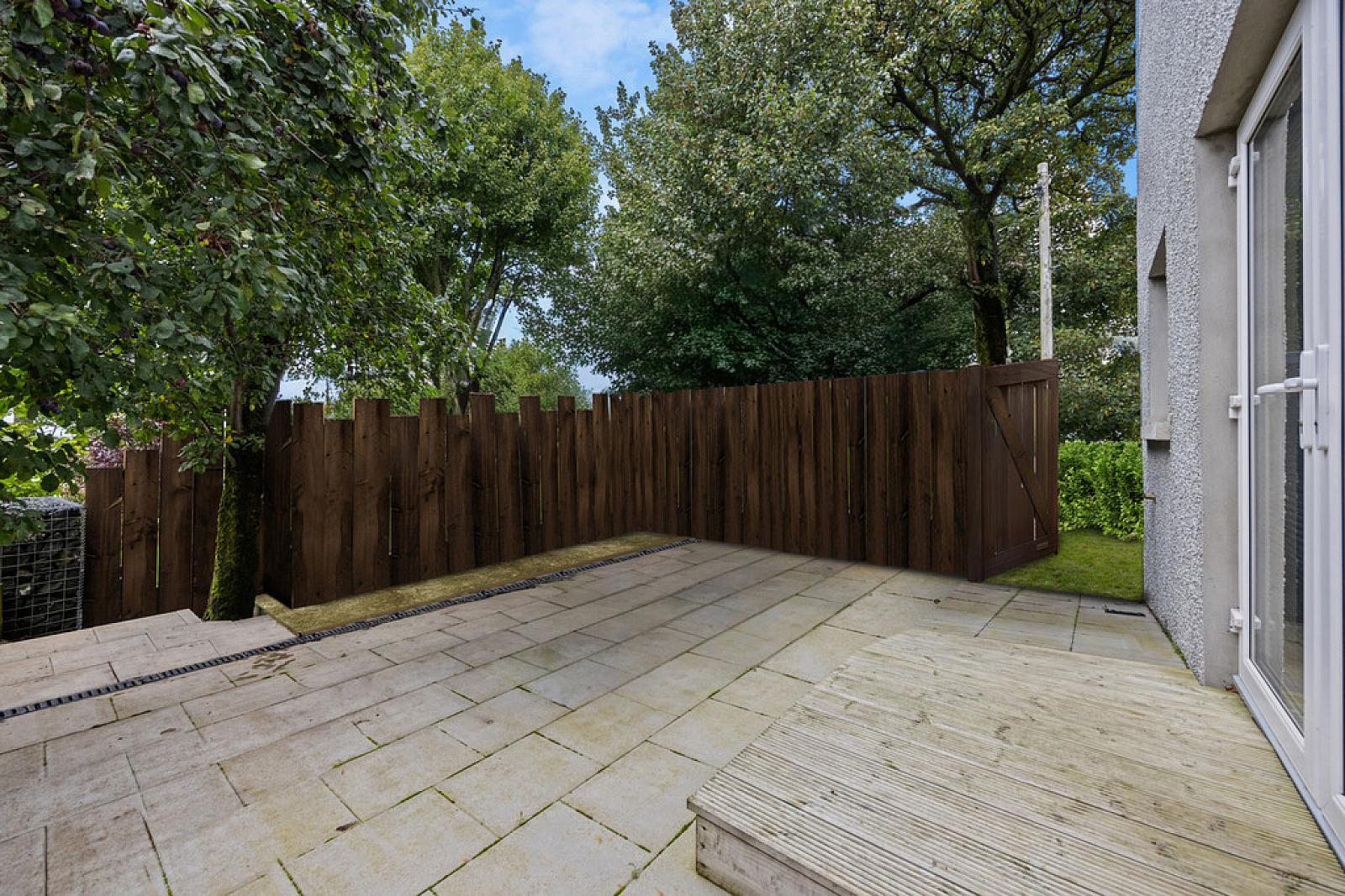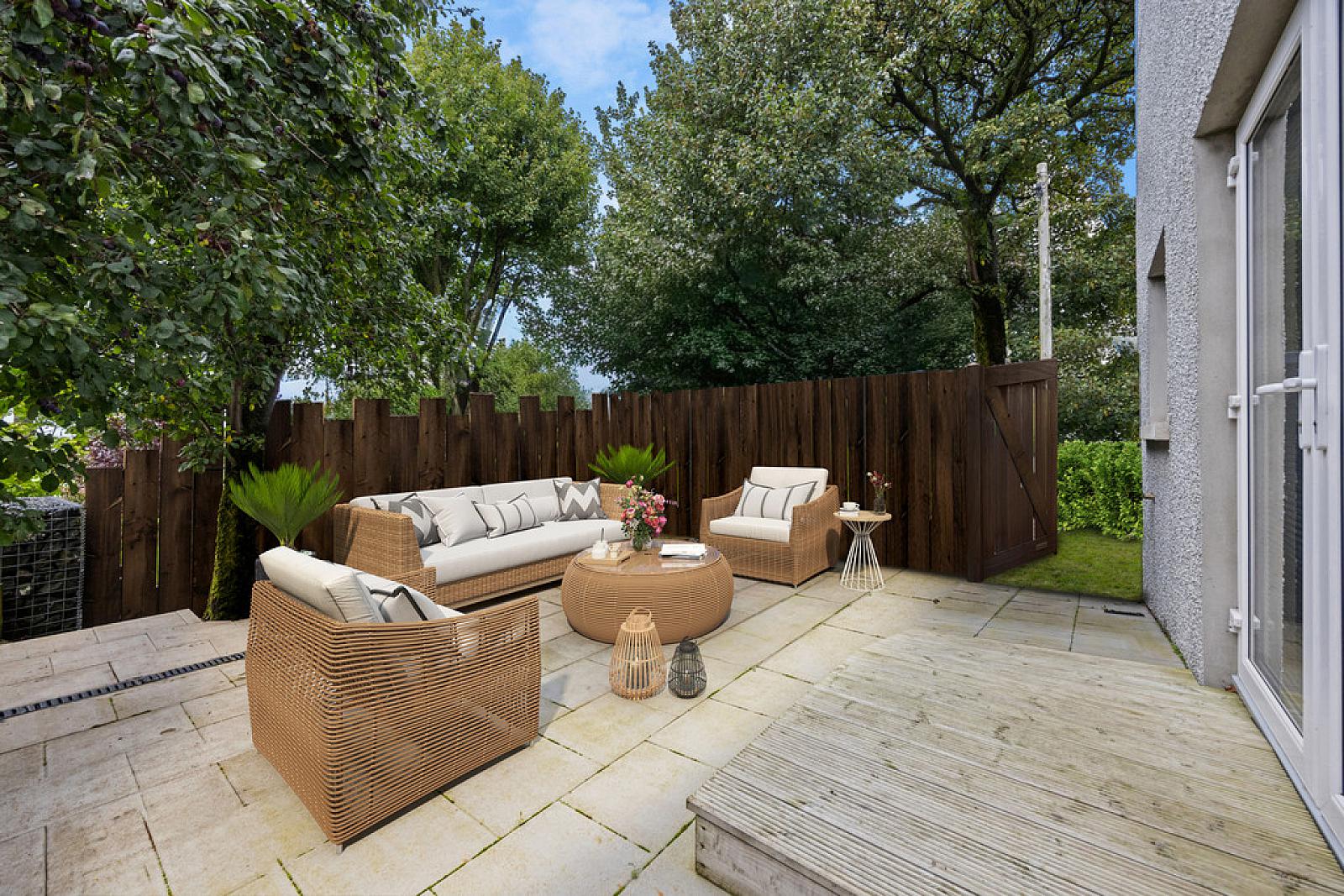 The rear enclosed patio garden offers the perfect space to enjoy a BBQ and relax. To the front is a driveway with parking for three cars.