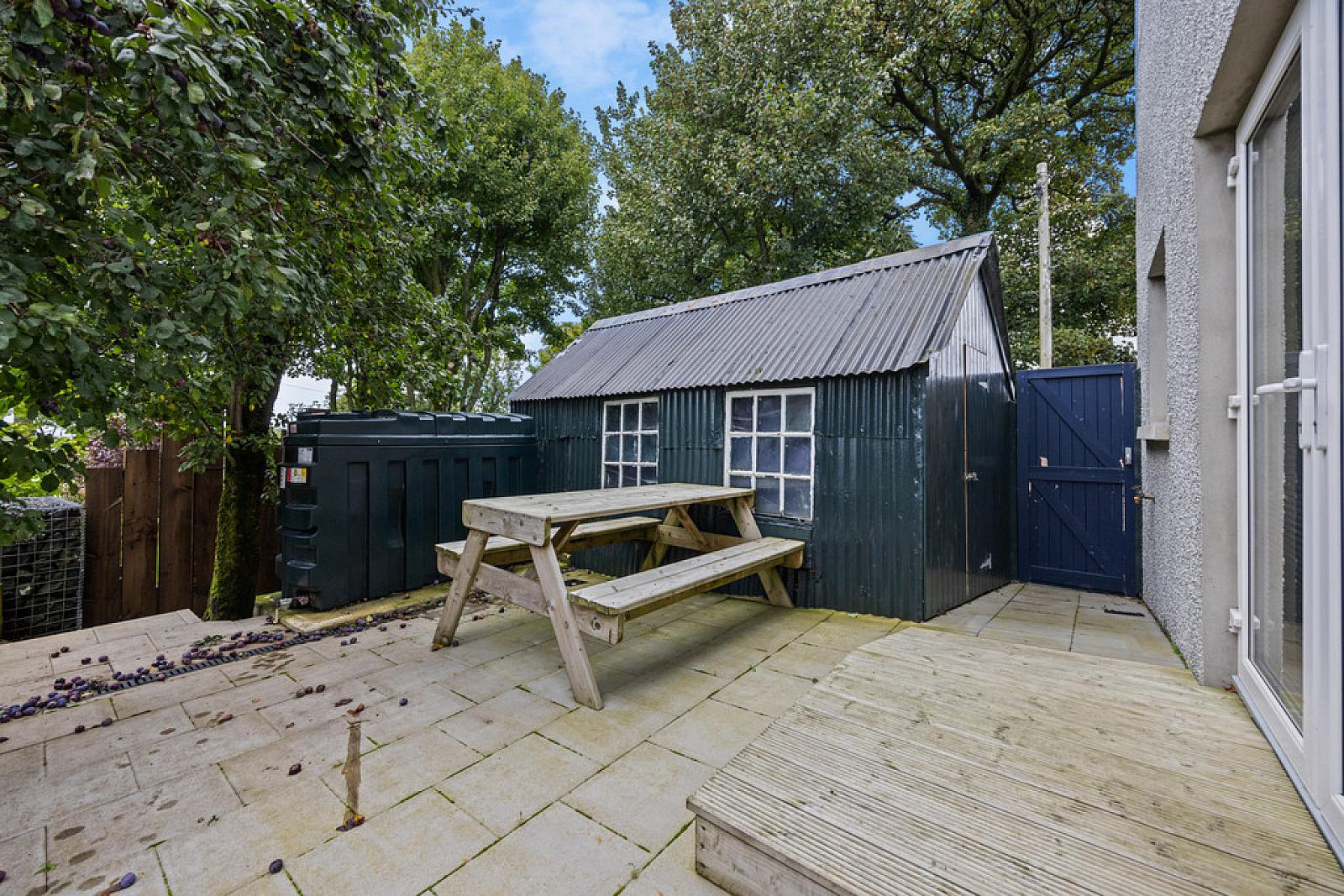 OUTSIDE Driveway with car parking for three cars. Enclosed rear patio garden, paved patio area, uPVC oil tank, traditional corrugated large shed.