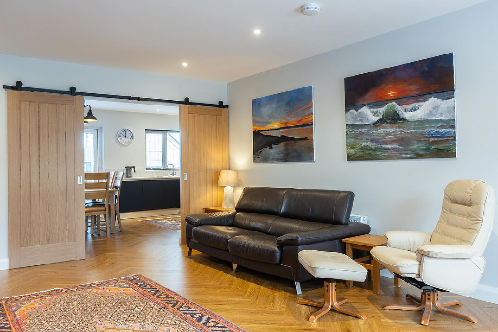 LOUNGE 19' 10" x 14' 9" (6.05m x 4.5m) Herringbone flooring, recessed low voltage spotlights, 9kw integrated contemporary wood burning stove, feature sliding doors leading to...