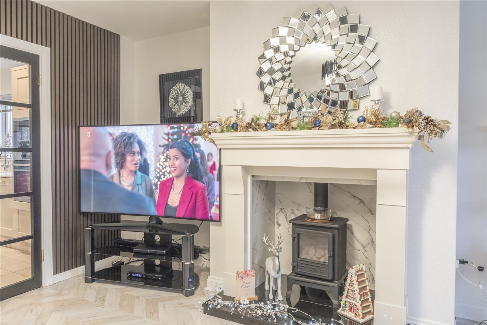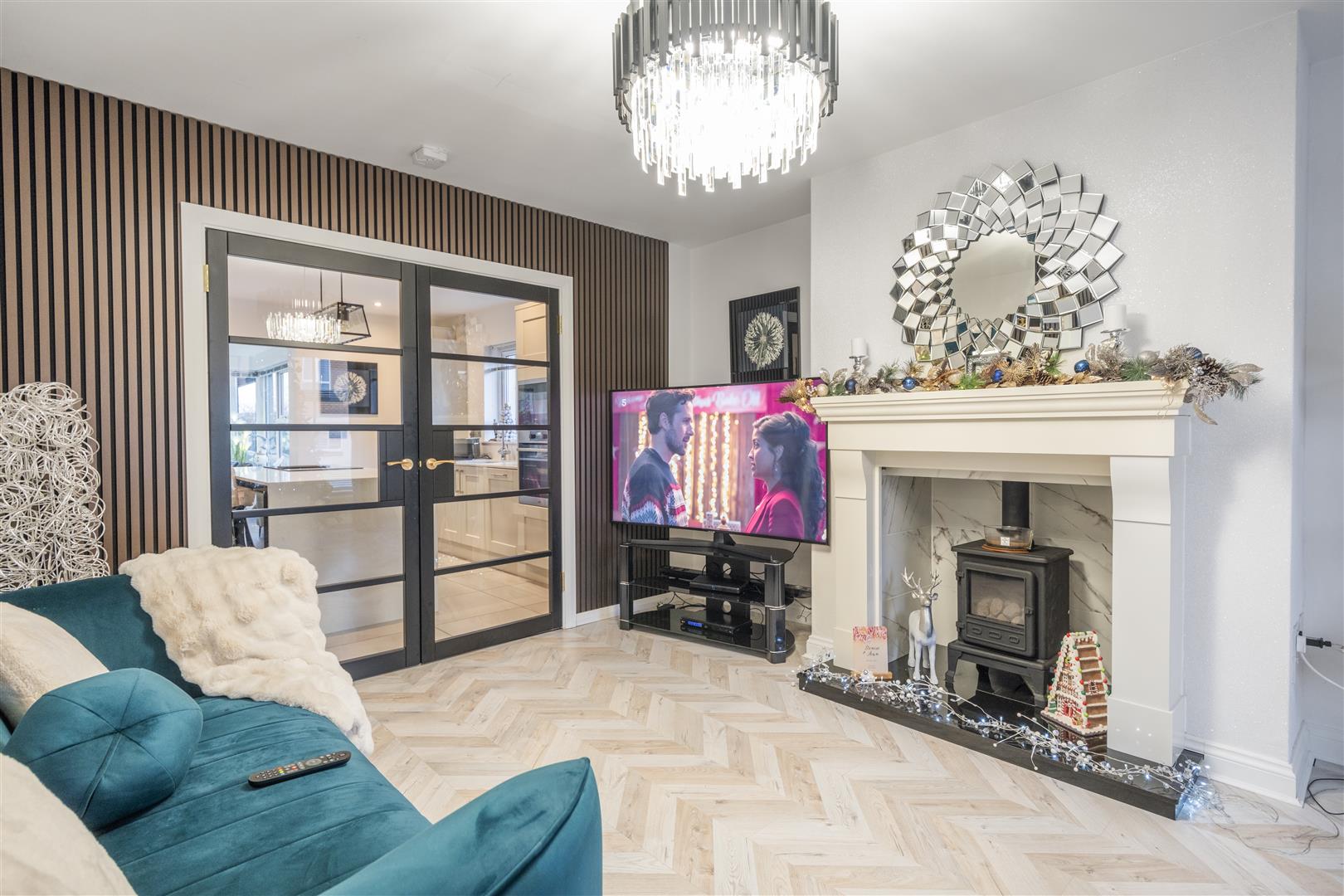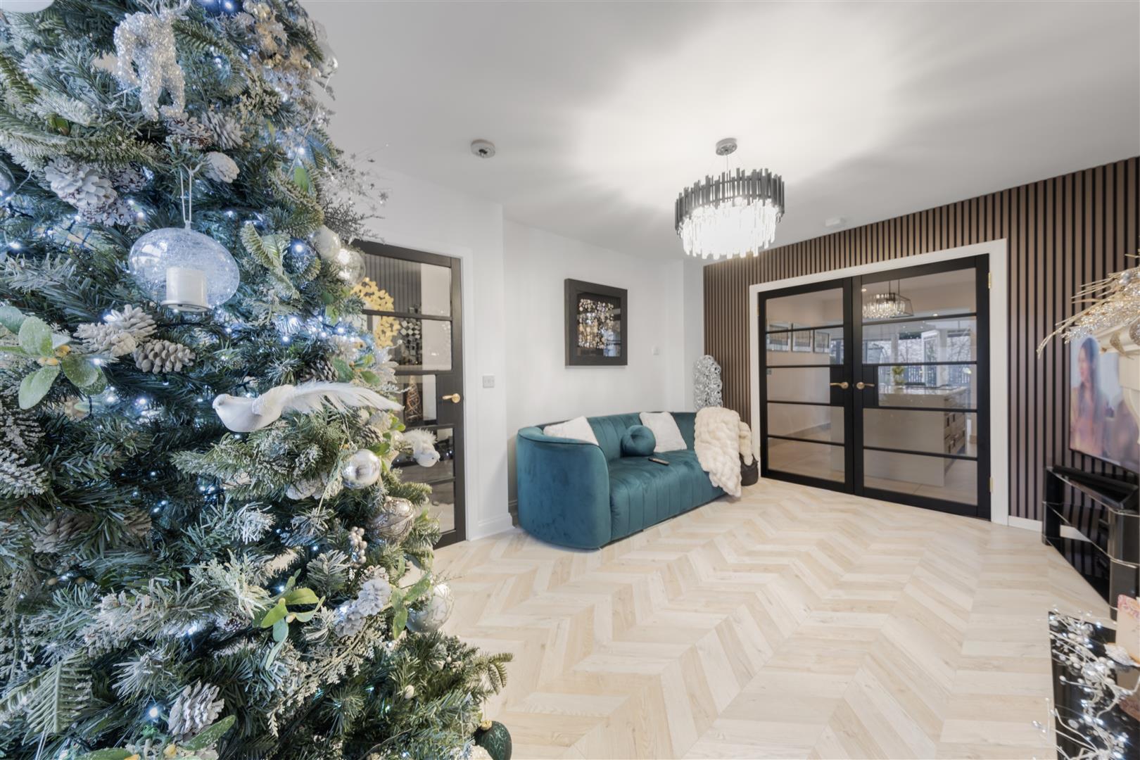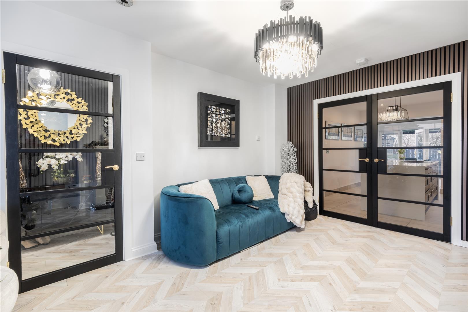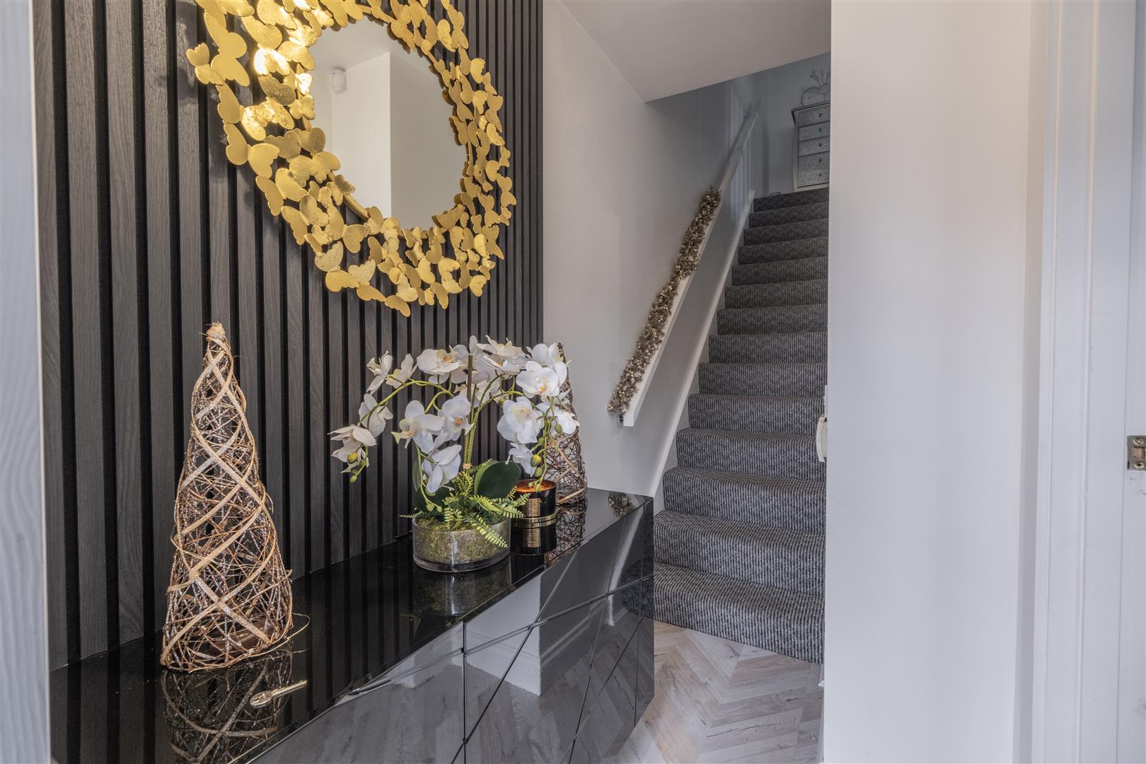 Stylish composite front door opening into a bright entrance hall with striking decorative wood panelling and herringbone flooring. Stairwell to first floor. Glazed black internal door leading to lounge.