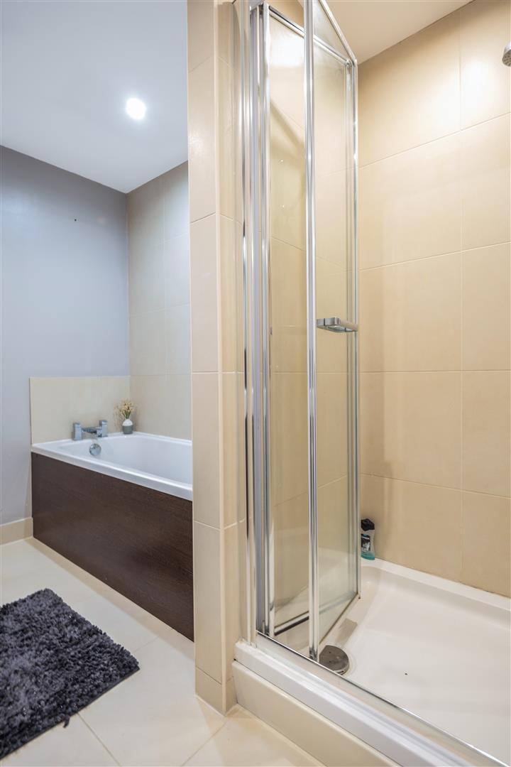 Luxury four piece suite including bath, separate shower enclosure, WC and vanity unit. Contemporary tiling throughout.