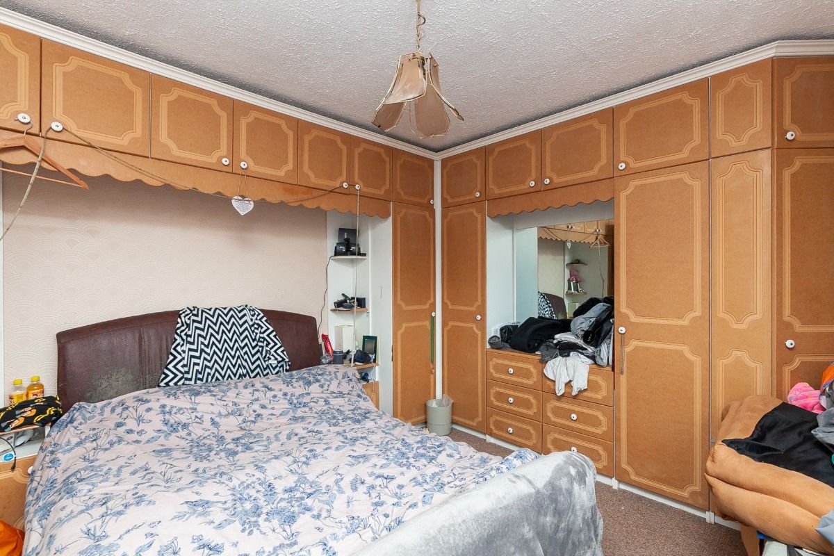 Generously sized double room with built-in wardrobe storage.