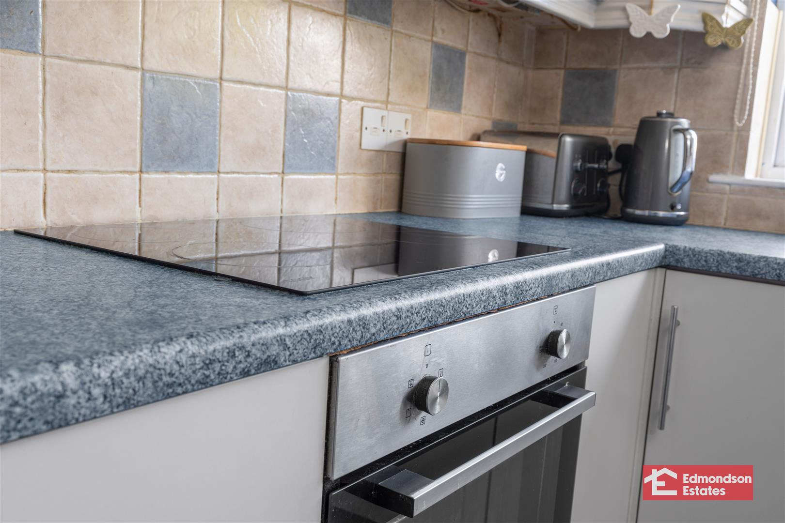 Modern fitted kitchen with high and low level storage units and work surfaces. Composite 1.5 bowl sink unit. Integrated appliances to include oven and 4 ring electric hob with extractor fan over. Space for fridge freezer. Part tiled walls and tiled floor.