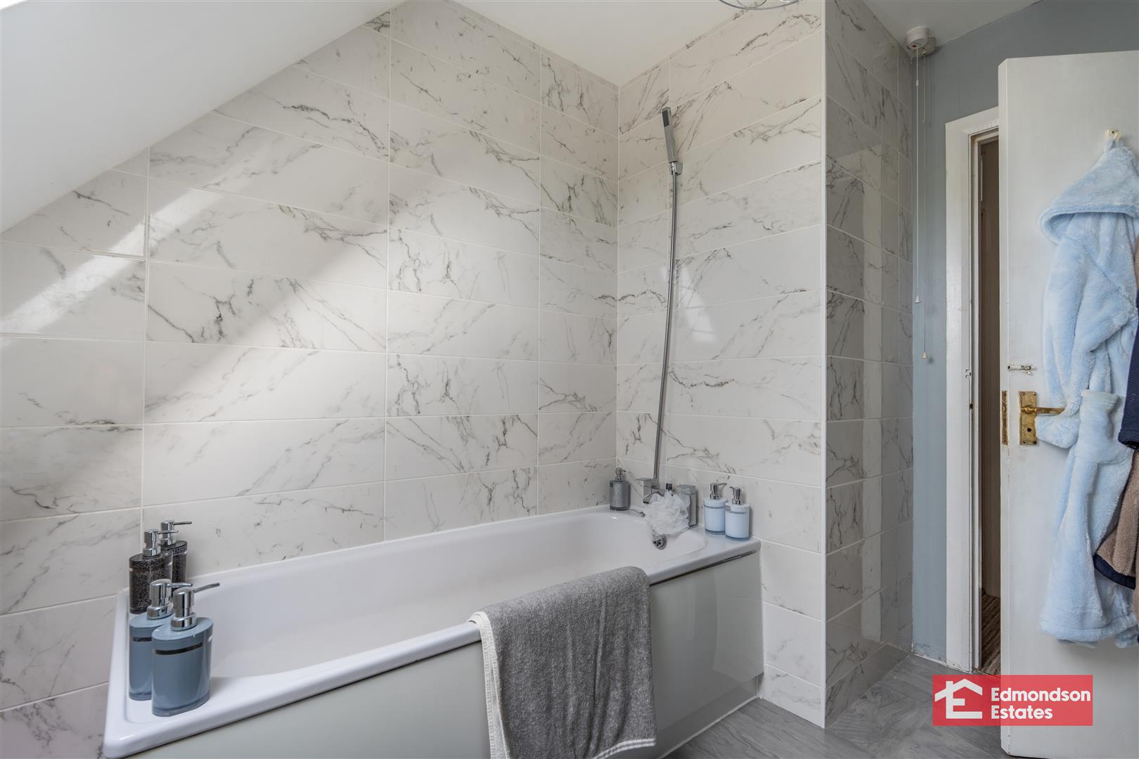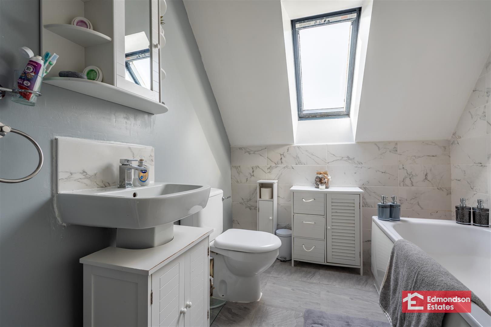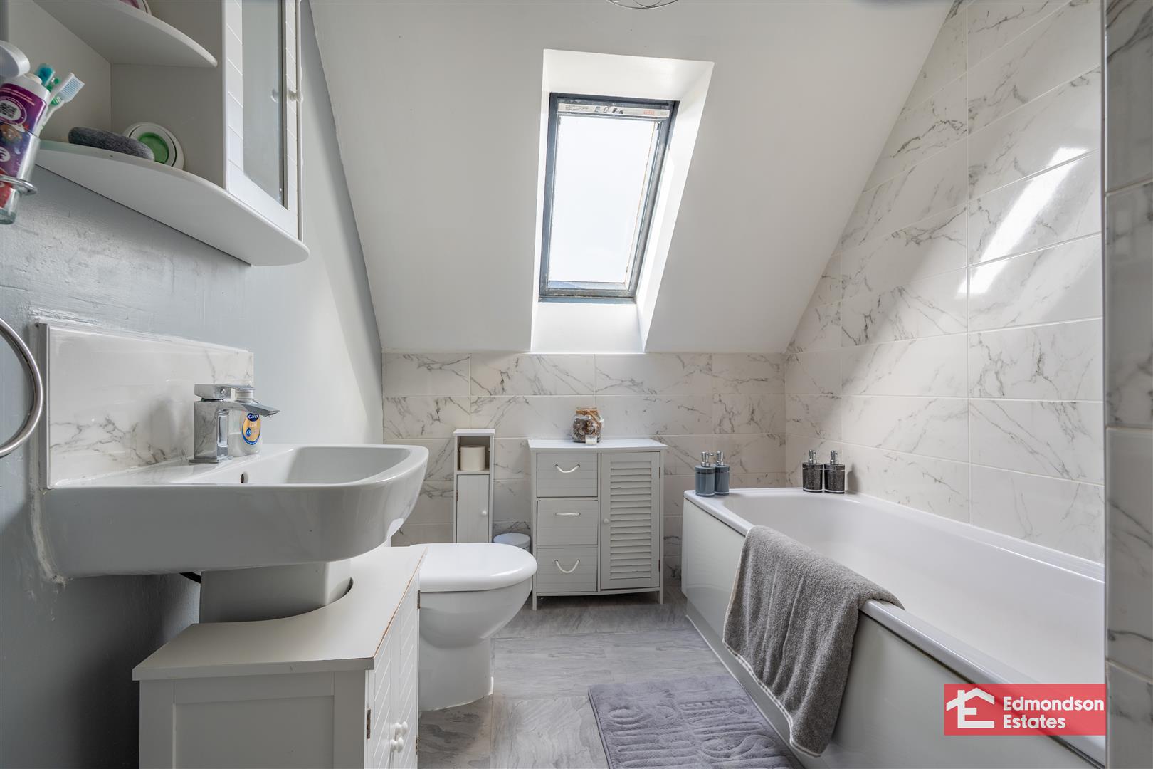 Modern fitted three piece suite comprising panelled bath, wash hand basin and WC. Fully tiled walls and tiled floor. Velux window.