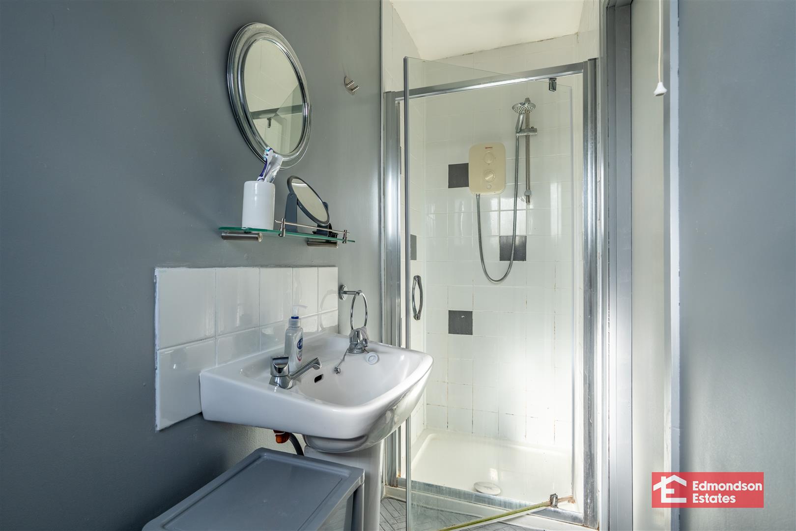 Modern fitted three piece suite comprising shower cubicle with electric shower over, wash hand basin and WC. Fully tiled walls to shower.