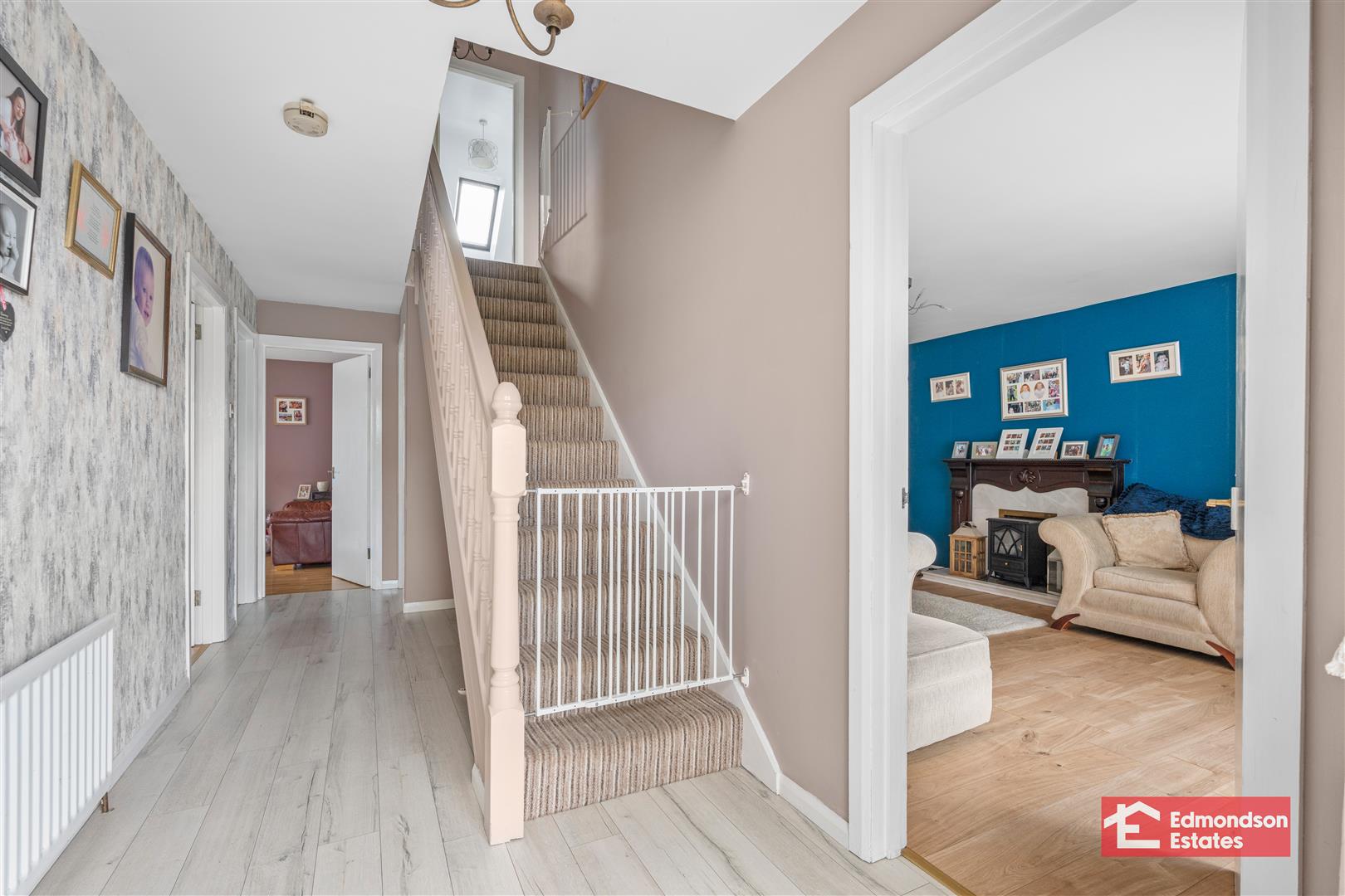 PVC double glazed front door with side screen. Stairwell to first floor. Wood laminate floor covering.