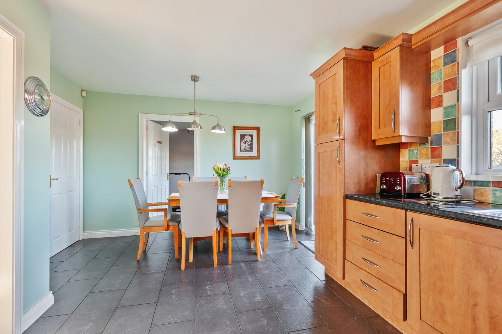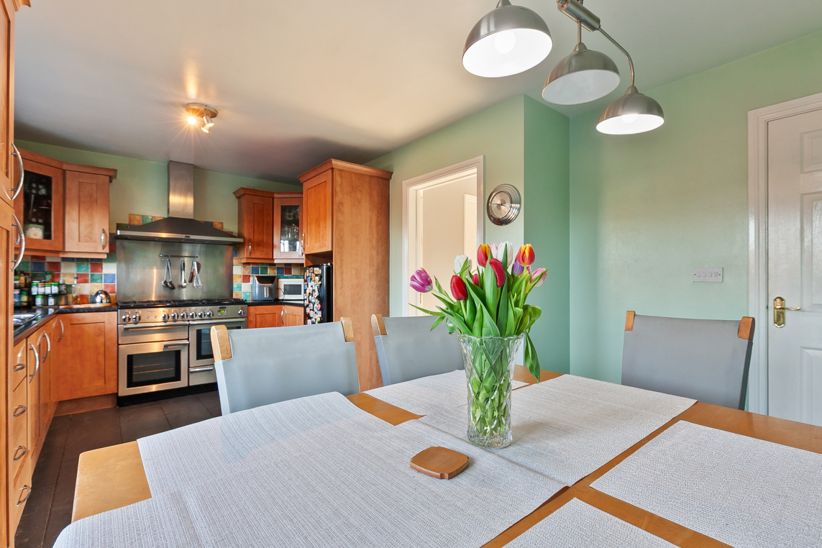 At the heart of the home is the open plan kitchen and dining area, which provides a superb space for everyday living and hosting guests. The kitchen is well appointed and features a Rangemaster cooker with gas hob, offering both style and practicality. A separate utility room, plumbed for both washing machine and dryer, provides additional storage and functionality.