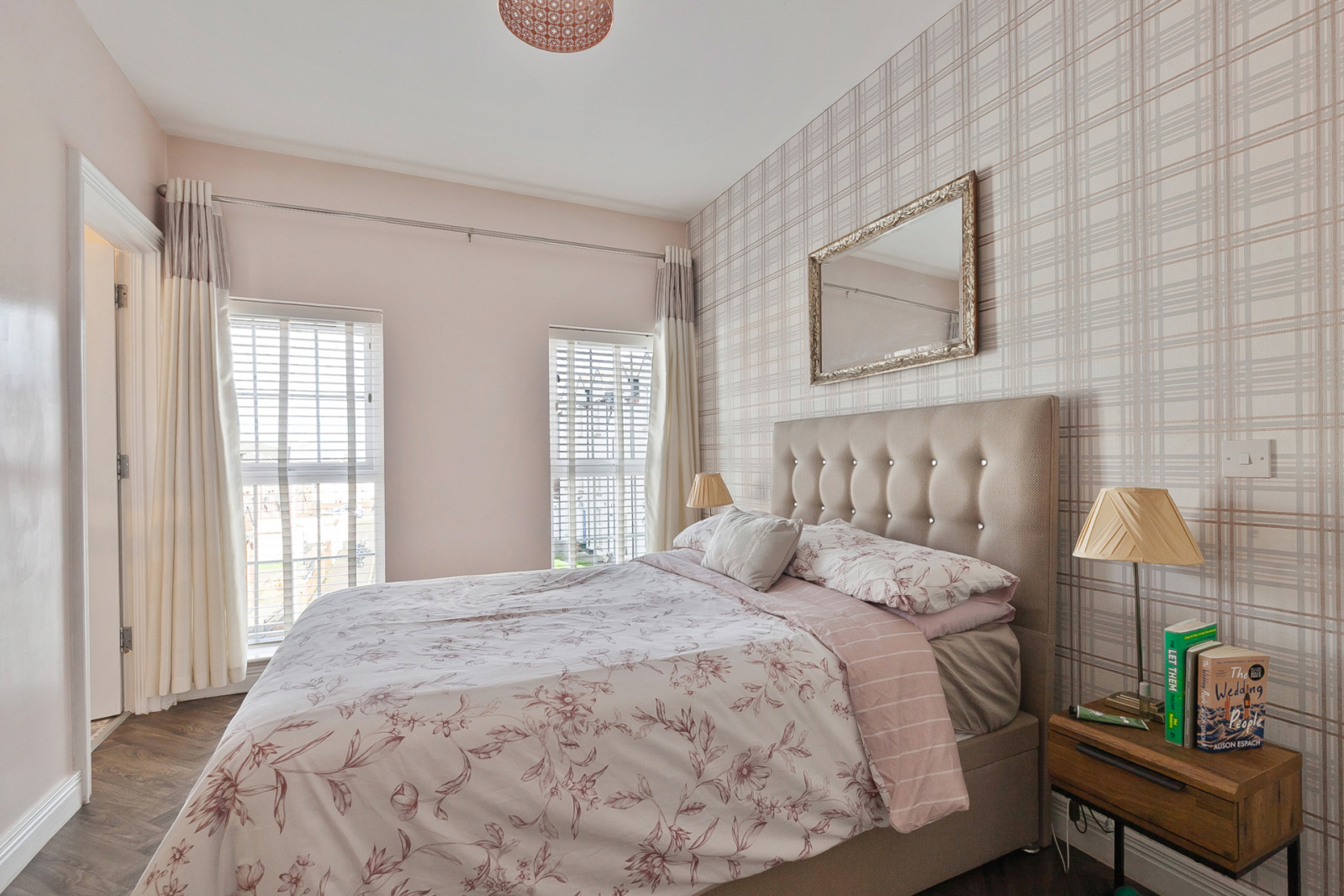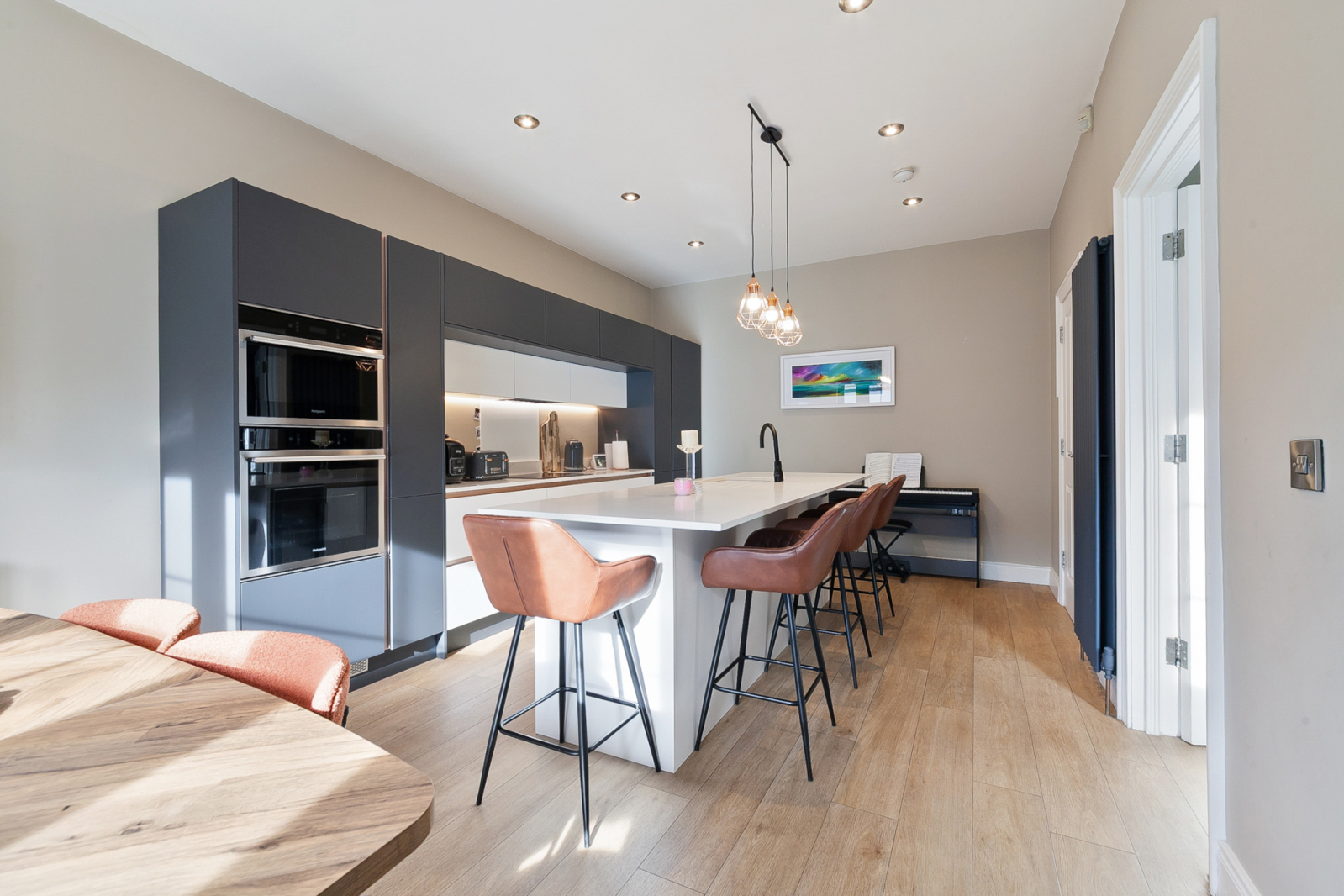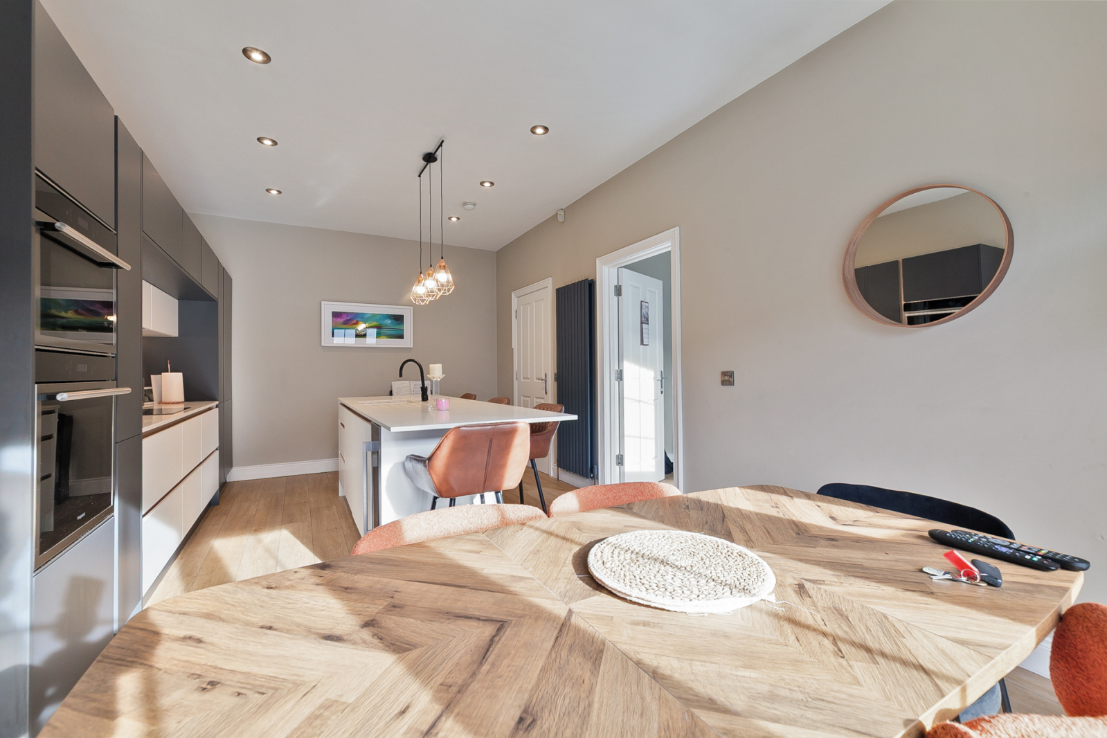 The heart of the home is the impressive open plan kitchen and dining area. The sleek, contemporary kitchen boasts high-end finishes, ample storage and a striking feature island, perfect for both everyday living and entertaining. The space flows seamlessly into the formal dining area, with patio doors leading to a fully enclosed rear garden. Just off the kitchen is a practical utility room, fully plumbed for white goods, along with a convenient ground floor WC.