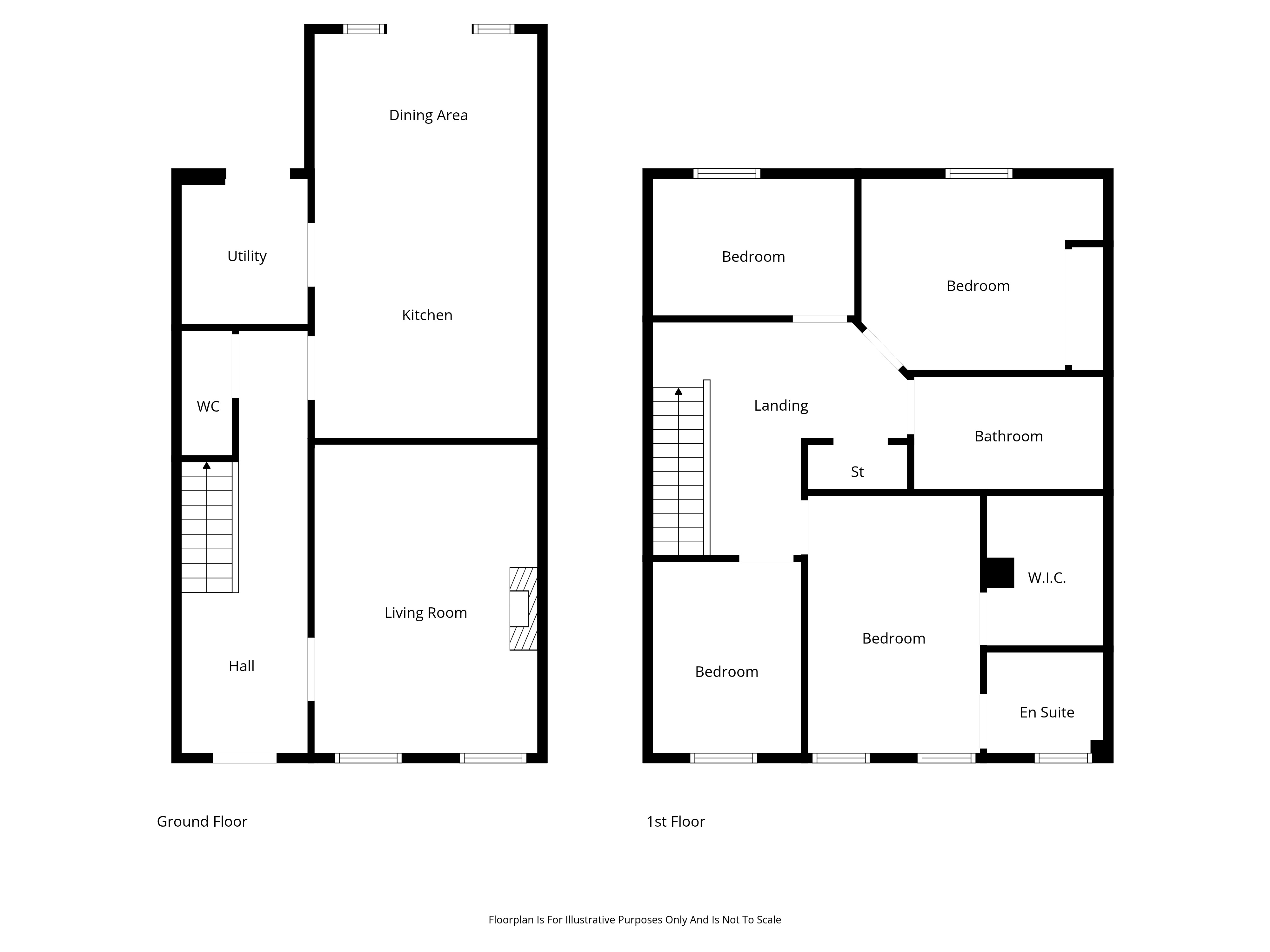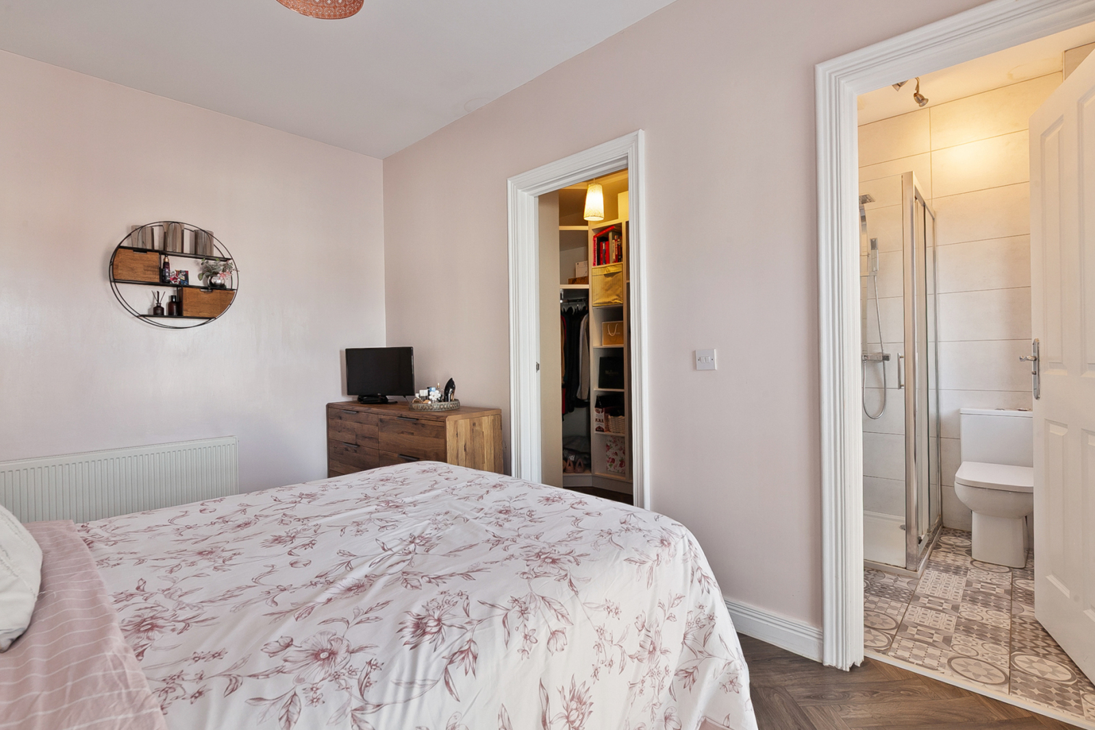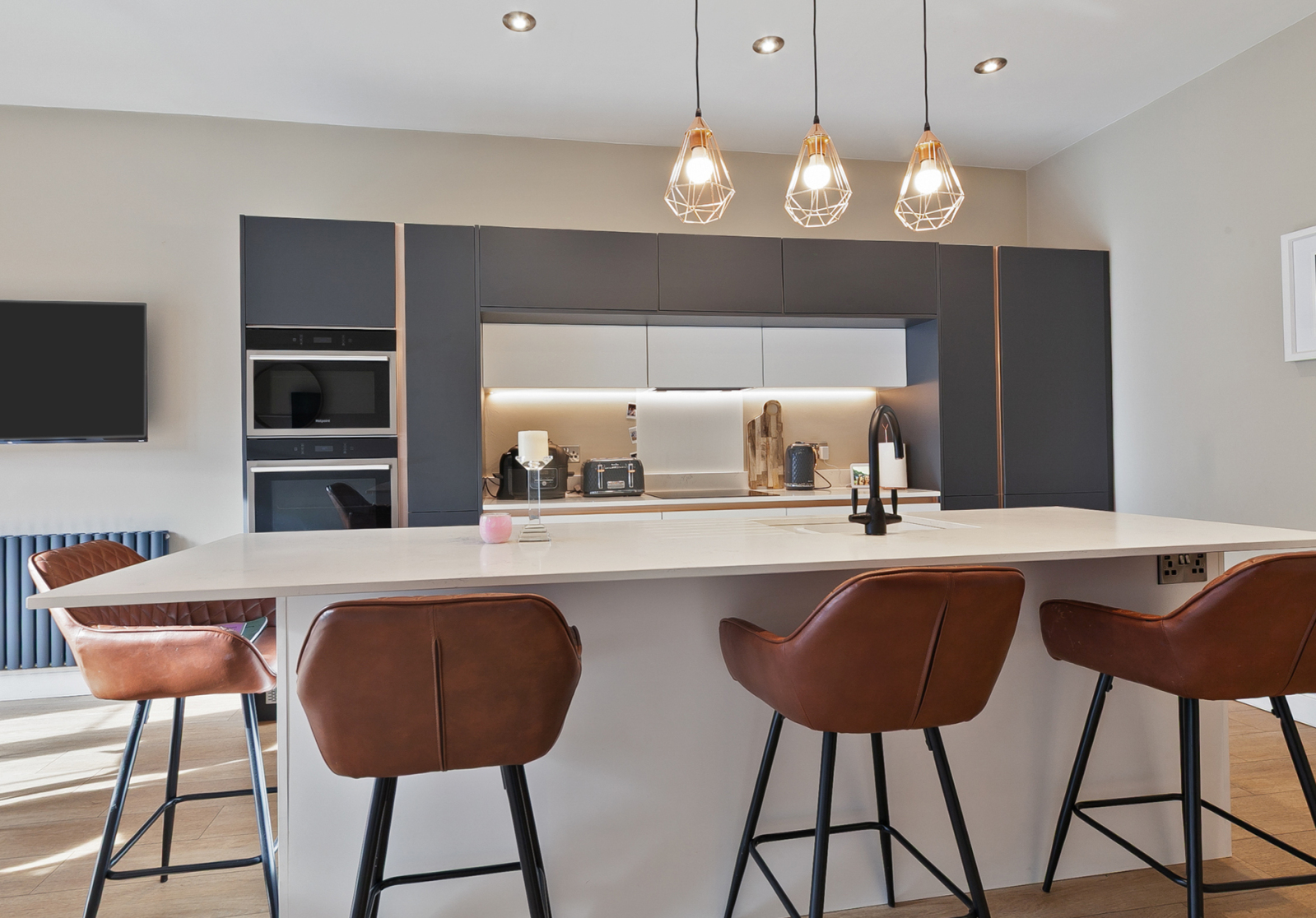 The heart of the home is the impressive open plan kitchen and dining area. The sleek, contemporary kitchen boasts high-end finishes, ample storage and a striking feature island, perfect for both everyday living and entertaining. The space flows seamlessly into the formal dining area, with patio doors leading to a fully enclosed rear garden. Just off the kitchen is a practical utility room, fully plumbed for white goods, along with a convenient ground floor WC.