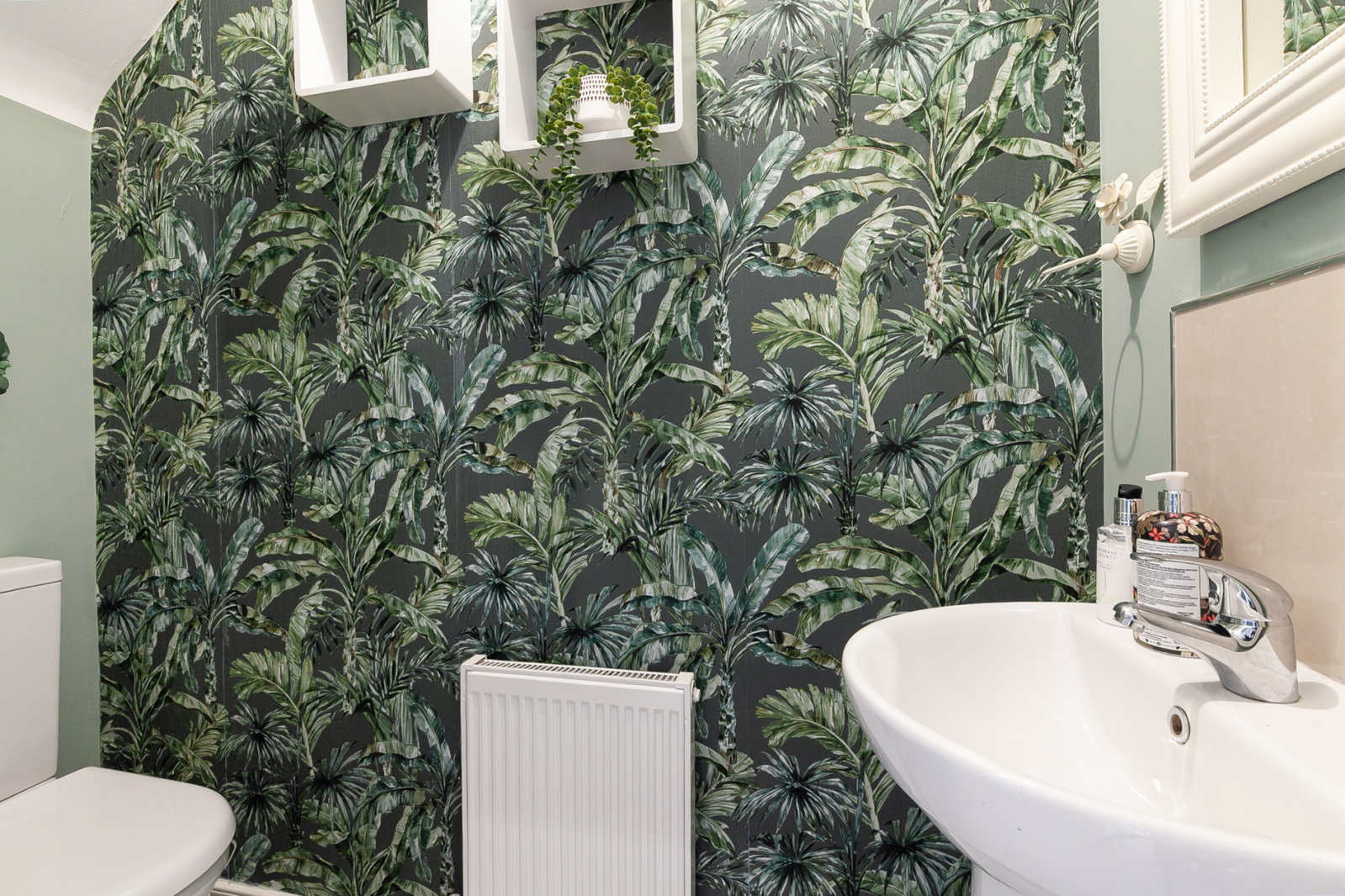 Comprises of low flush WC, pedestal wash hand basin with mixer tap and tiled splash back. Tiled floor and extractor fan.