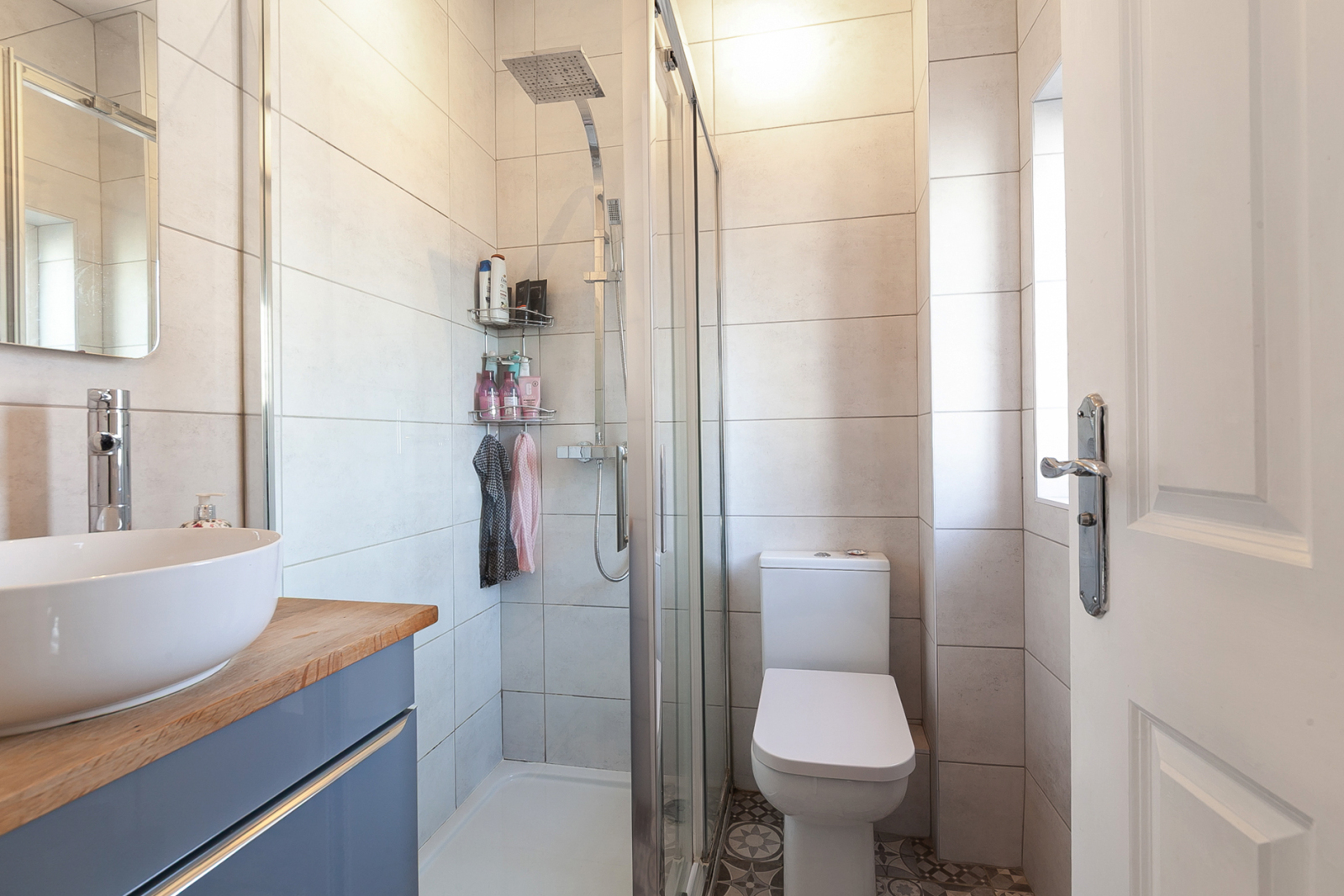 Comprises of enclosed corner shower unit with shower screen, low flush WC, ceramic bowl sink unit with vanity storage underneath. Low flush WC, tiled walls and floor and extractor fan.